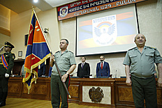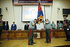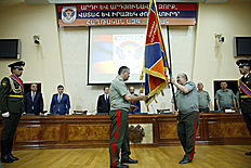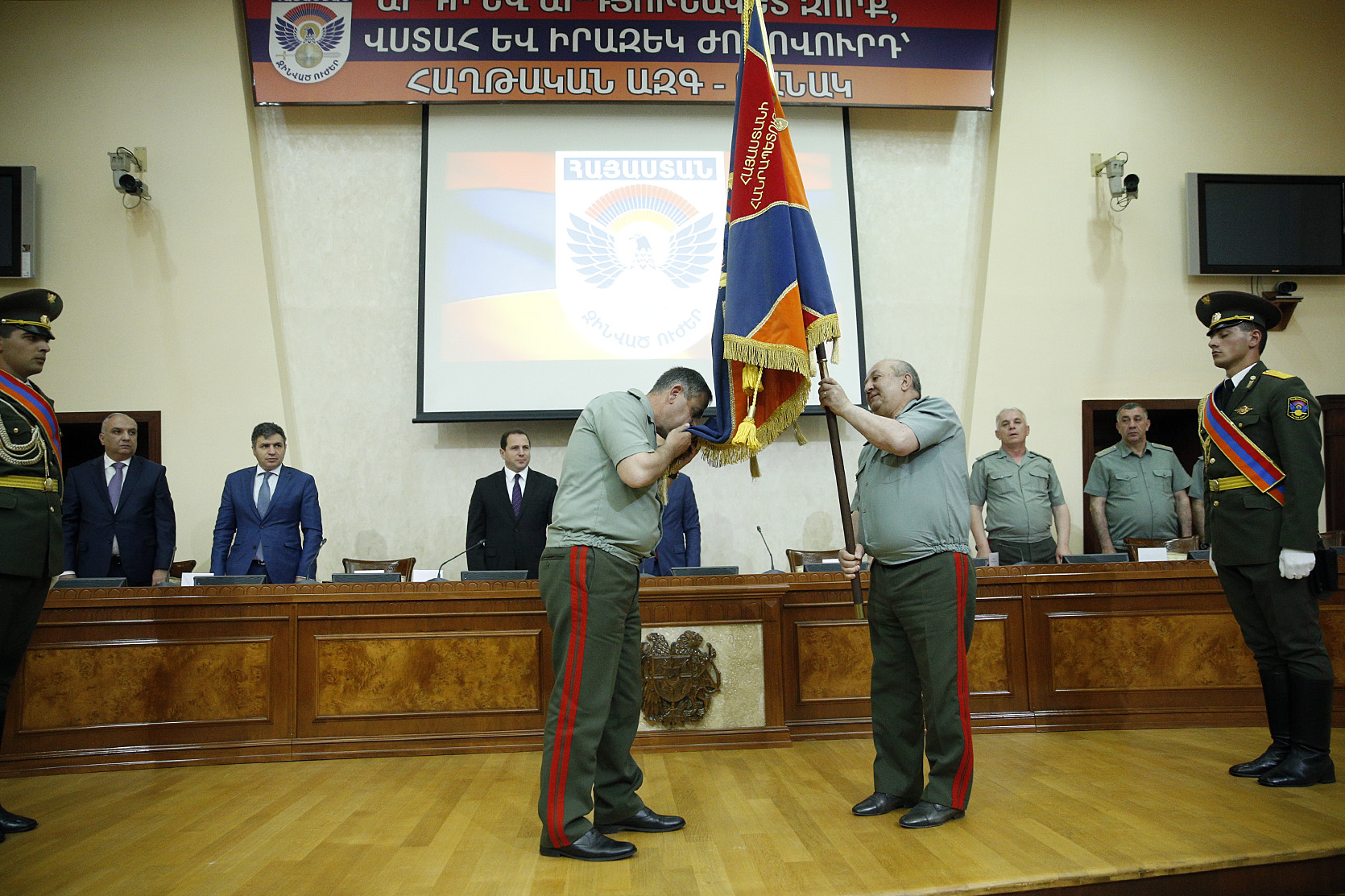 Then, according to the established procedure, a solemn ceremony of handing down the office of Chief of General Staff was held: Movses Hakobyan handed over the military standard of the Armed Forces to Artak Davtyan.