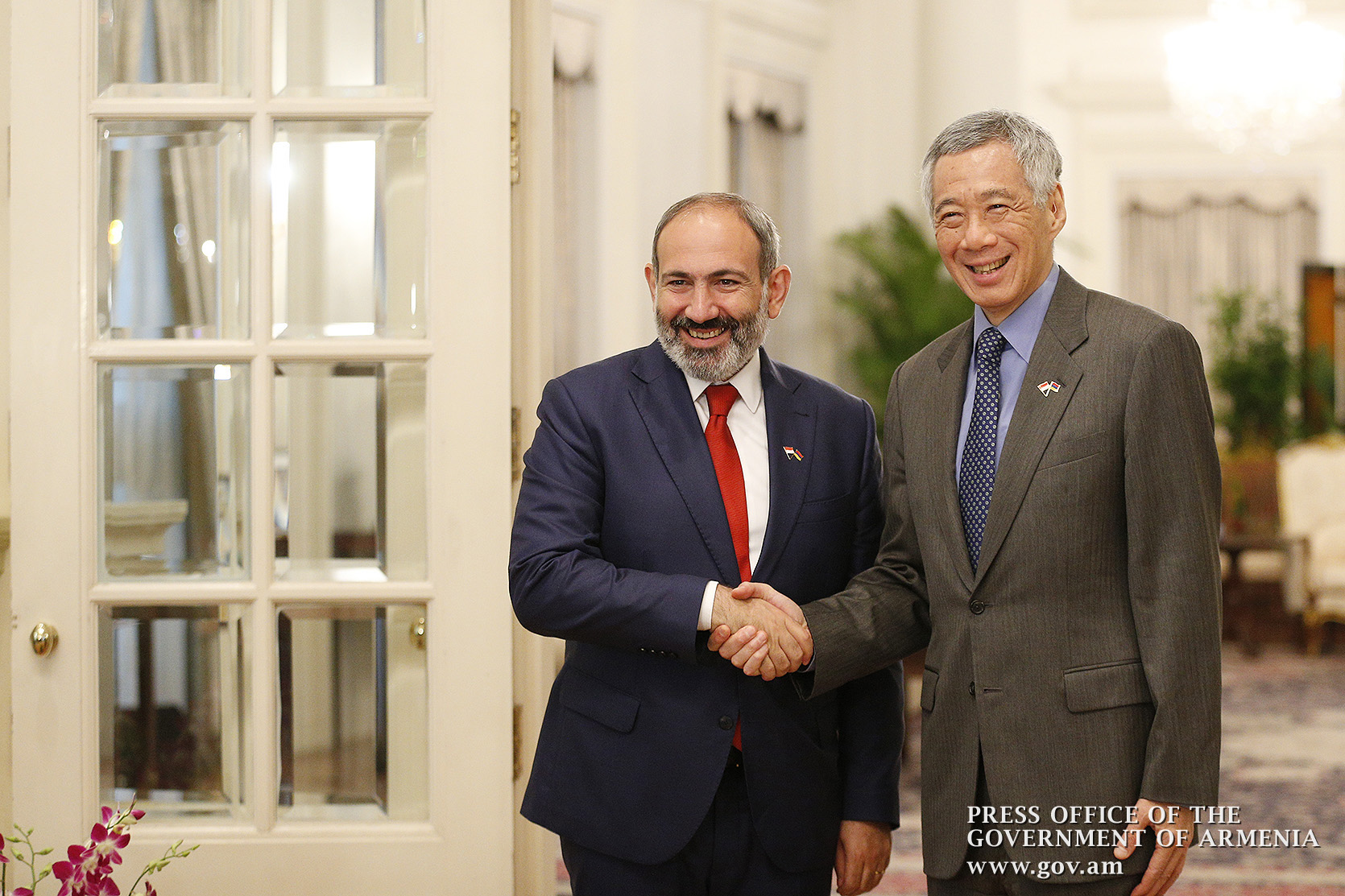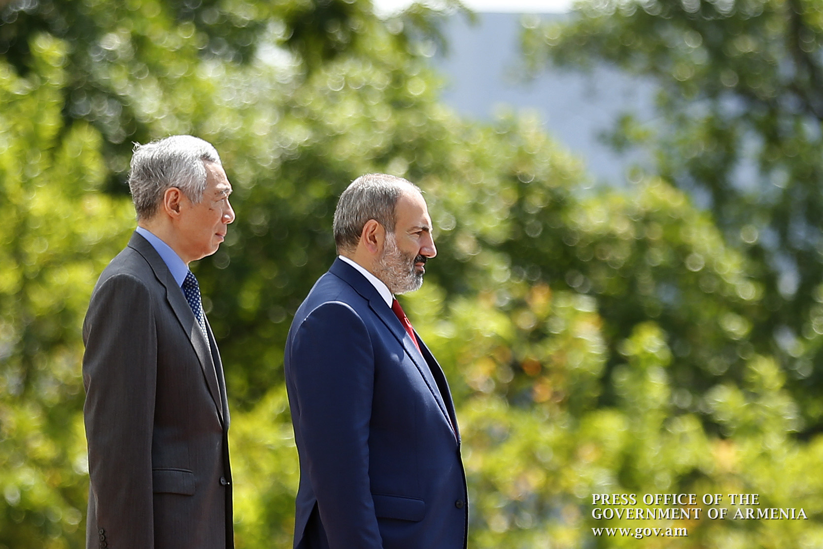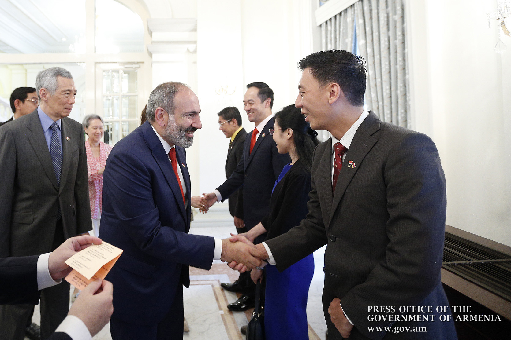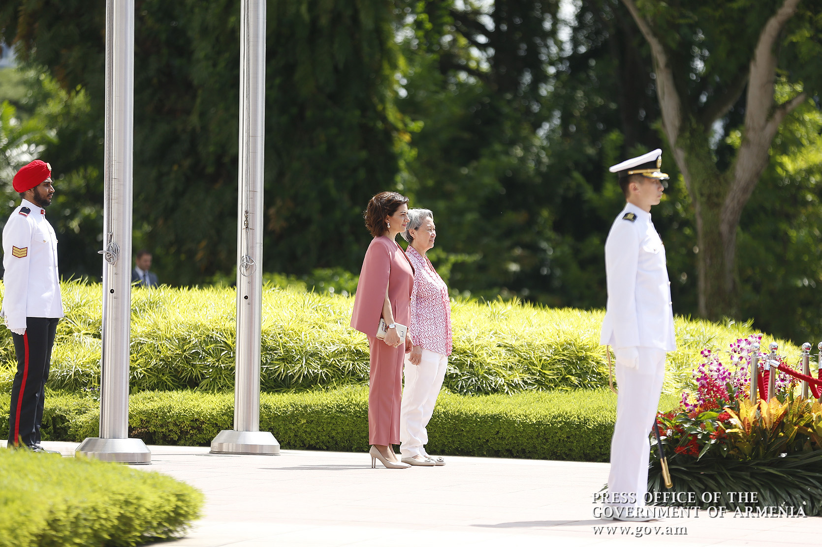 An official welcome ceremony for Prime Minister Nikol Pashinyan and Mrs. Anna Hakobyan was held at Istana, the Government Residence in Singapore. The Prime Minister and Mrs. Anna Hakobyan were welcomed by Prime Minister of Singapore Lee Hsien Loong and Mrs. Ho Chin. The national anthems of Armenia and Singapore were played, after which the two prime ministers and their spouses greeted the delegation members.