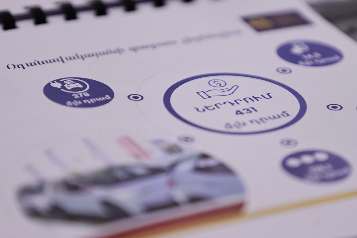 One company received a license to organize an airport taxi service. The company engaged 25 electric motor vehicles for the works in the airport area. The total investment of the company was 430 million AMD.
