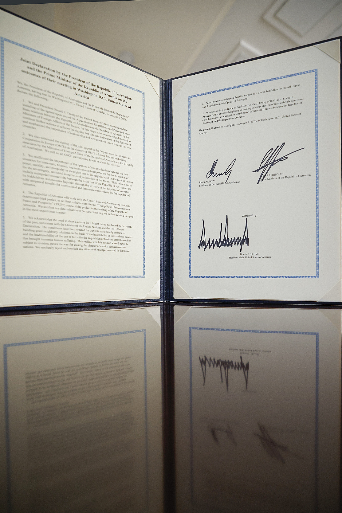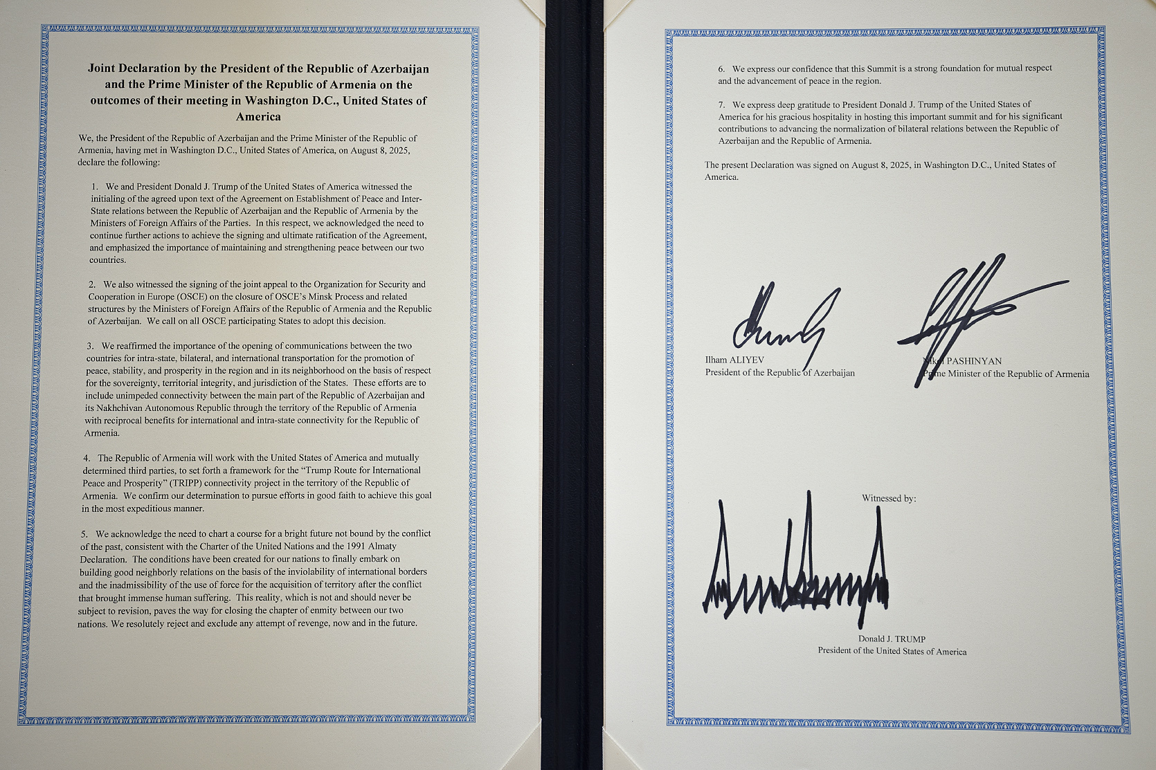 We, the President of the Republic of Azerbaijan, the Prime Minister of the Republic of Armenia and the President of the United States of America, having met in Washington D.C., United States of America, on August 8th, 2025, declare the following: