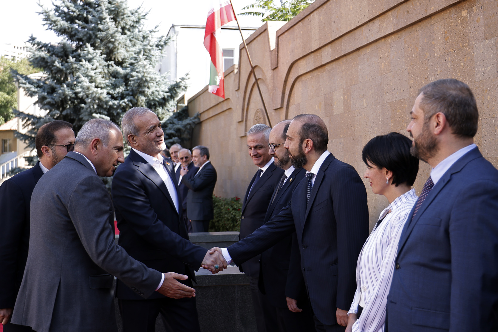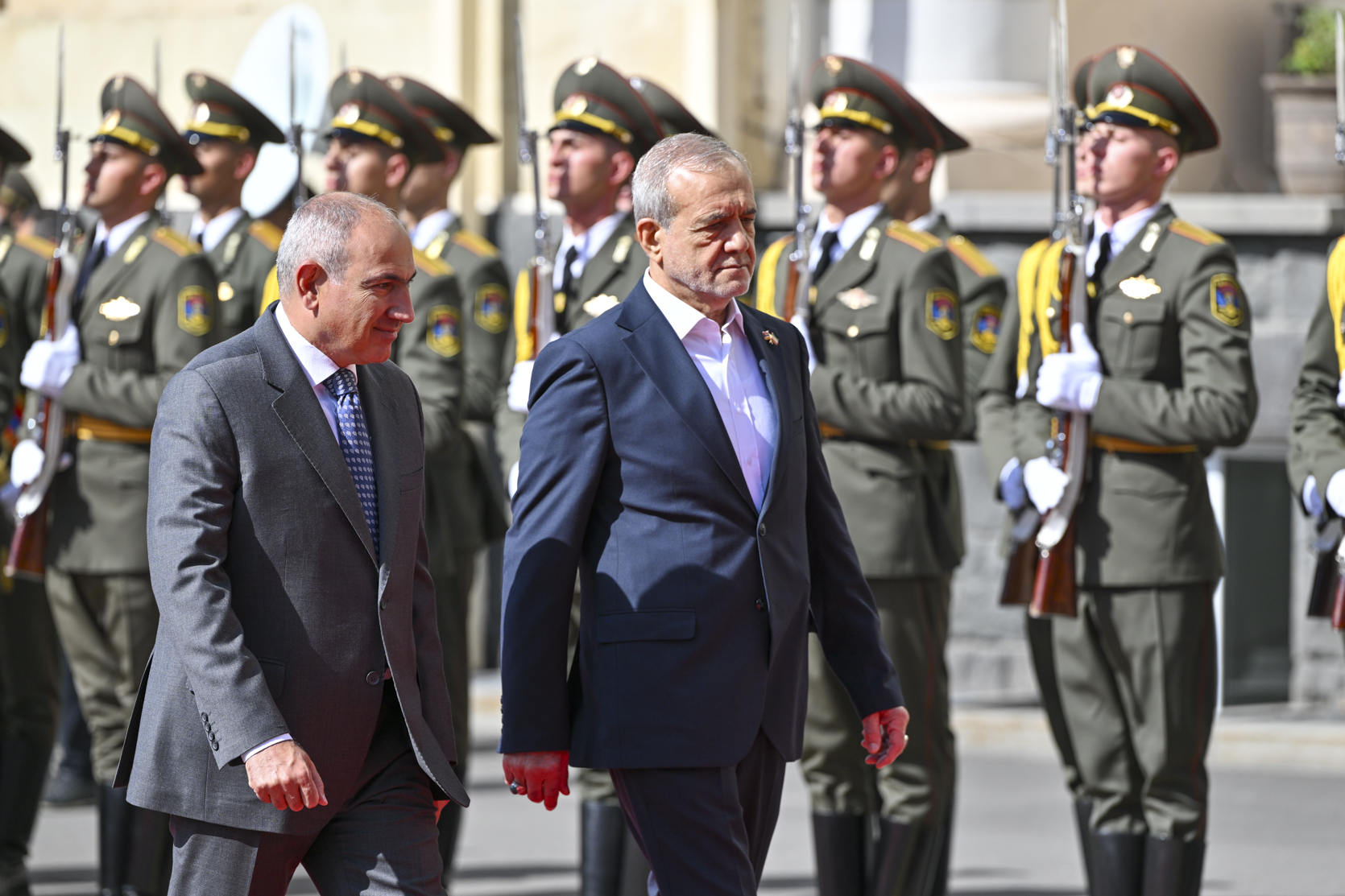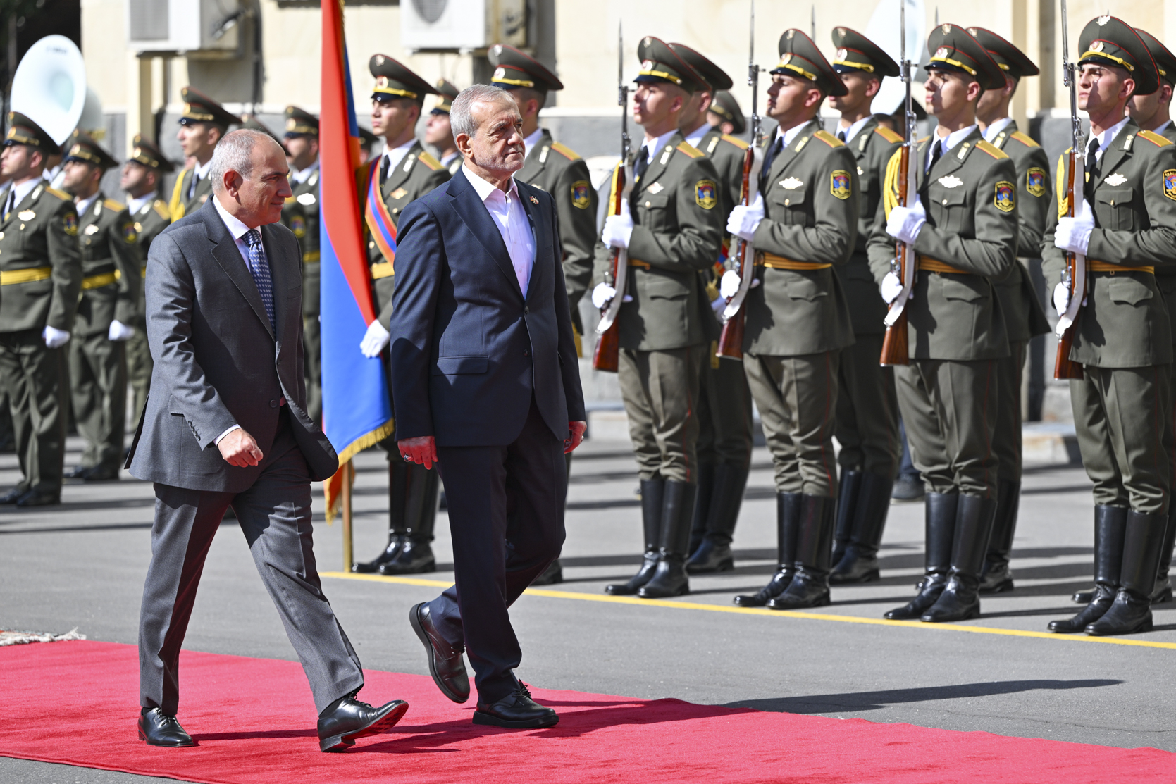 Prime Minister Nikol Pashinyan hosted Iranian President Masoud Pezeshkian, who arrived in Armenia on an official visit. First, an official welcoming ceremony was held, during which the national anthems of Armenia and Iran were performed, and then the leaders of the two countries welcomed the members of the delegations.