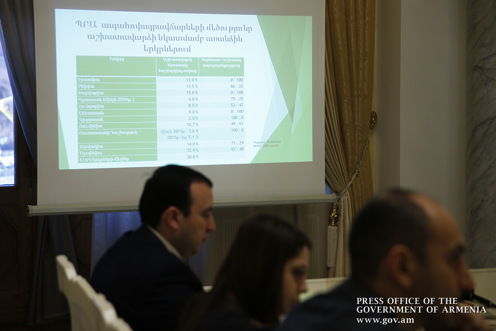 Le ministre de la Santé par intérim, Arsen Torosyan, a déclaré que que le travail a été fait pour définir les étapes nécessaires et qu'un document analytique pertinent a été élaboré. Il a présenté les objectifs de la mise en place d’un système d’assurance maladie intégré en Arménie: améliorer la qualité et l’accessibilité des soins et des services médicaux à la population, attirer de nouvelles sources de financement de la santé, mettre en place de nouveaux mécanismes de suivi de la qualité des soins de santé, améliorer la gestion de la sphère publique et éliminer le transfert d’argent souterraine. Torosyan a également introduit les principes de mise en œuvre du système: garantir la solidarité sociale et l'équité dans le secteur de la santé, combinant les risques financiers liés aux soins médicaux pour divers groupes de la population et unifiant les ensembles de services fournis. Arsen Torosyan a également présenté une analyse de la portée du système, des étapes de sa mise en œuvre, du montant de son assurance maladie, de son estimation des contributions, des mécanismes institutionnels, financiers et de gestion nécessaires à la mise en œuvre du système, ainsi qu'une expérience internationale réussie dans ce sens.