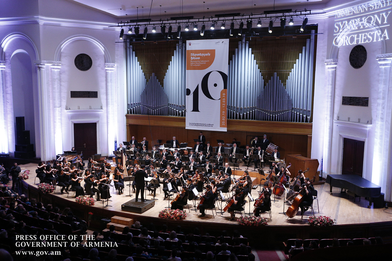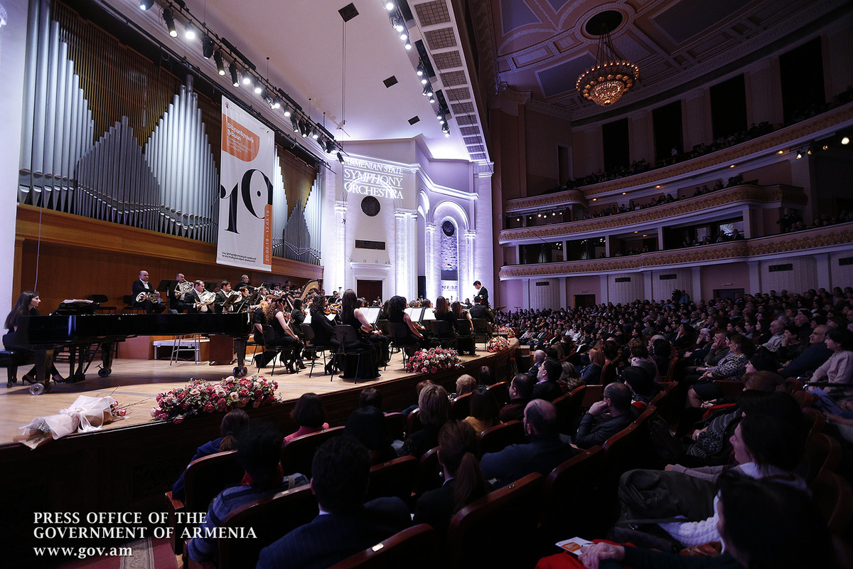 Le Premier ministre Nikol Pashinyan et Mme Anna Hakobian étaient présents à la cérémonie d'ouverture du 10e festival d'art des compositeurs arméniens à la salle de concert Aram Khachaturian, au cours de laquelle l'Orchestre symphonique de l’Etat d'Arménie dirigé par le chef d'orchestre Serguei Smbatian et l'Artiste populaire de la République d'Arménie, la soprano Hasmik Papian, ont donné un concert.