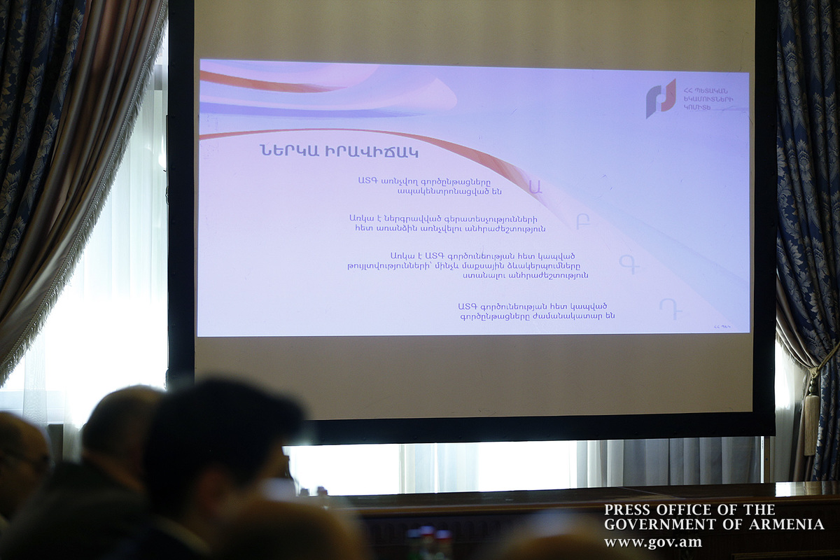 David Ananyan, président du Comité des recettes de l’État, a présenté en détail les démarches et les objectifs proposés par le projet. Selon lui, il est proposé d'inclure les fonctions des différents départements dans le principe du «Guichet unique» pour la réglementation des processus d'exportation et d'importation pour les détenteurs d'activités économiques étrangères. Selon Ananian, cela facilitera la simplification des procédures et des services fournis. Les objectifs du projet sont: la décentralisation des formalités de la zone franche, la mise à niveau des points de traitement de la charge sur le territoire de la République d’Arménie, l’application des pratiques, des tarifs et des procédures standard pour toutes les entreprises, la mise en place de procédures et de services basés sur le principe «Guichet unique», l'amélioration de la qualité des services fournis aux entrepreneurs et ainsi de suite.