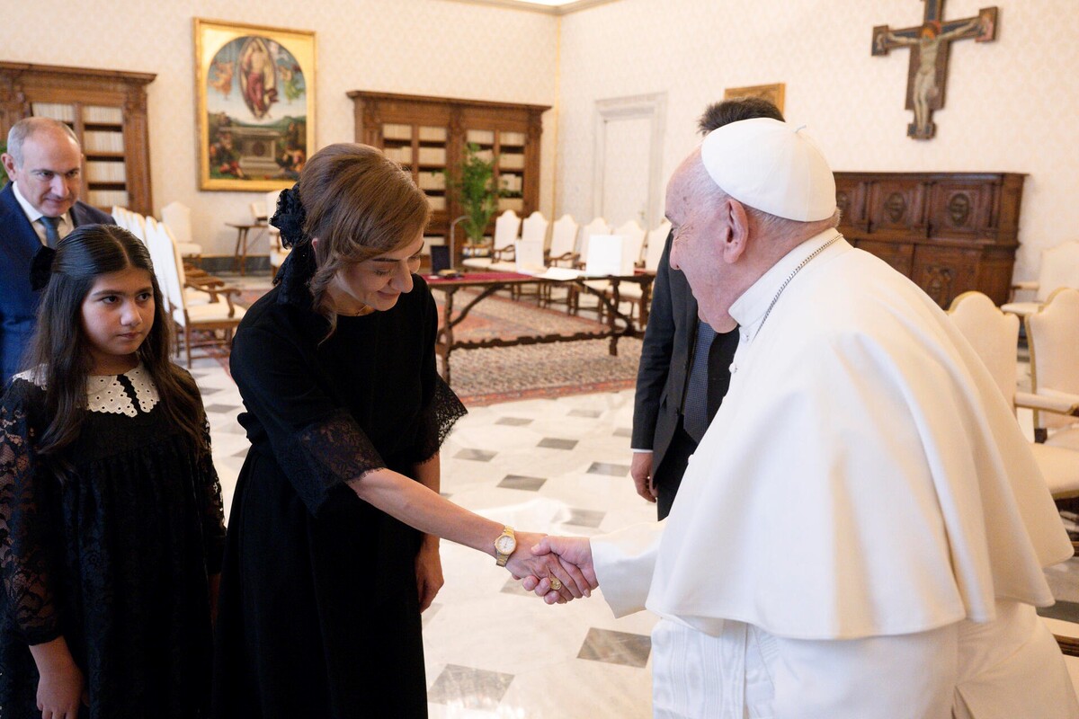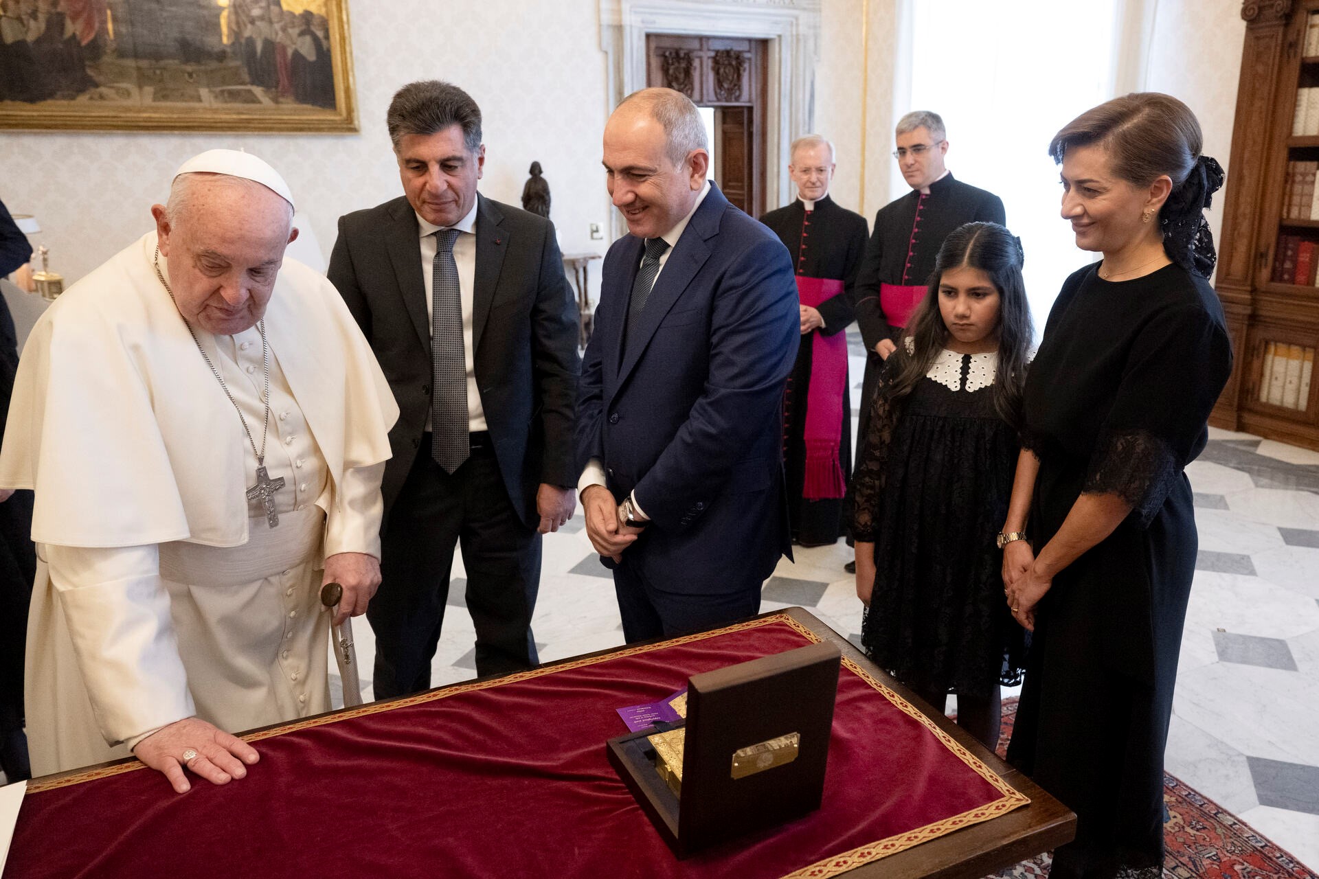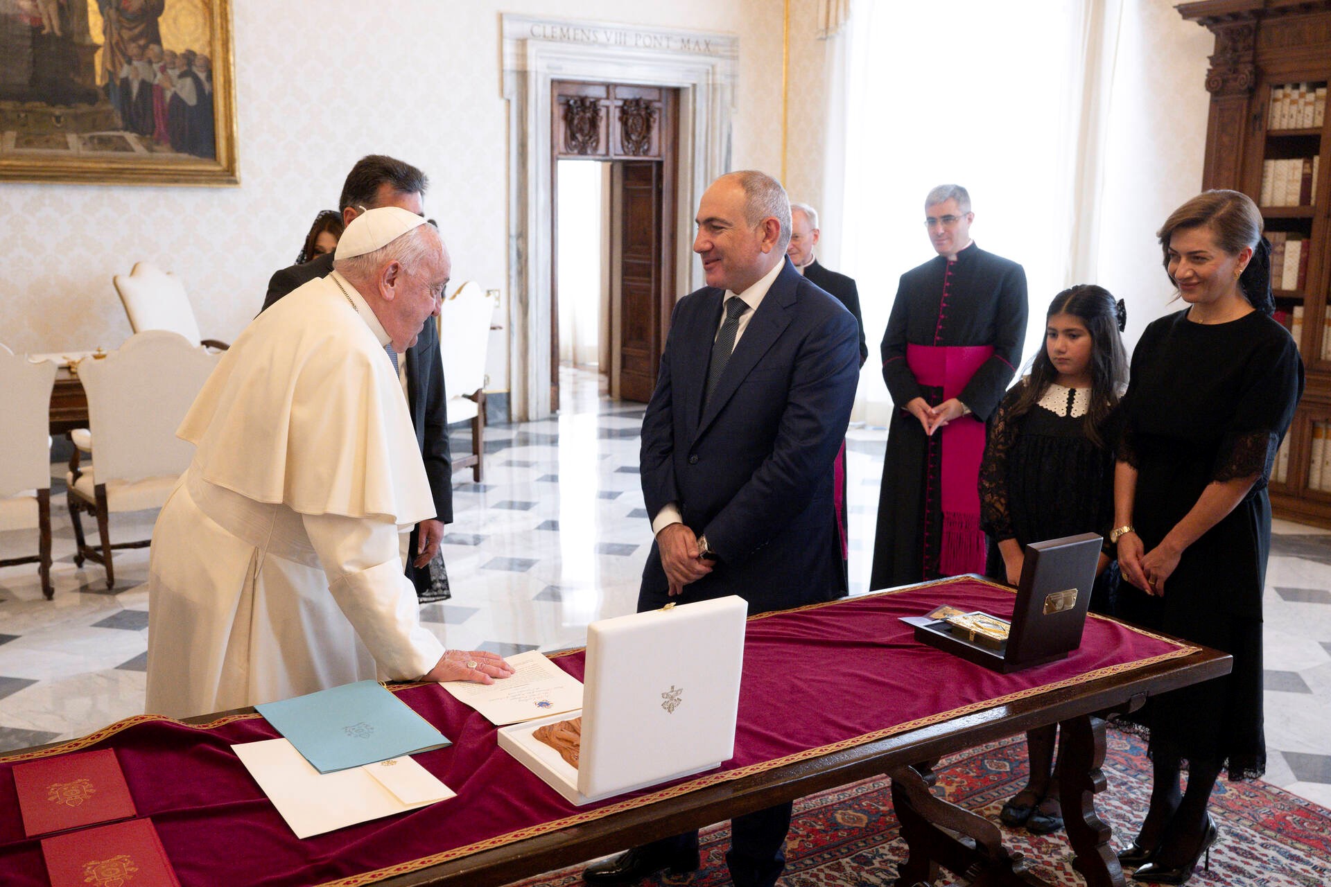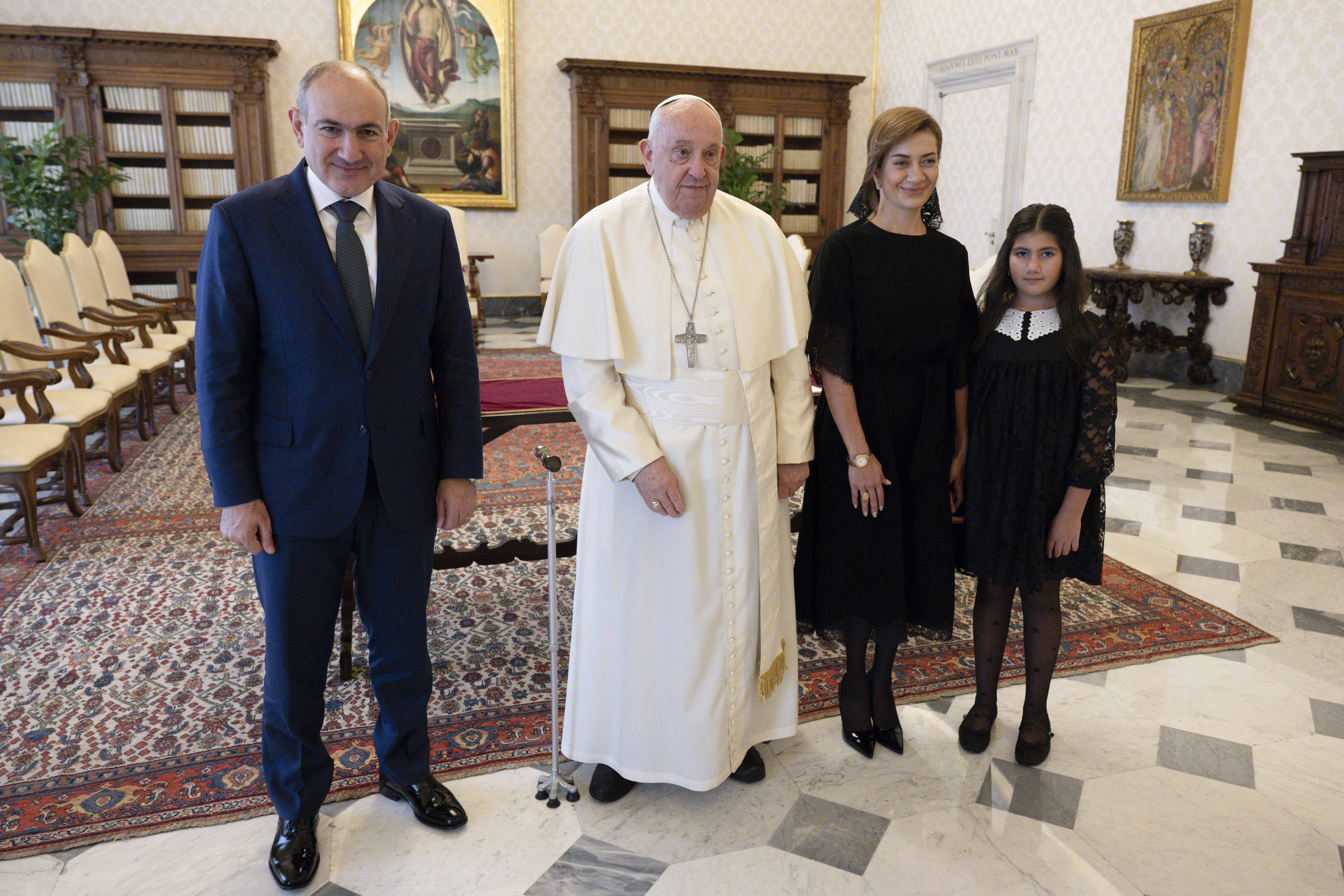 À l'issue de l'entretien privé, le pape François a salué l'épouse du Premier ministre, Anna Hakobyan, sa fille et les membres de la délégation accompagnant le Premier ministre.