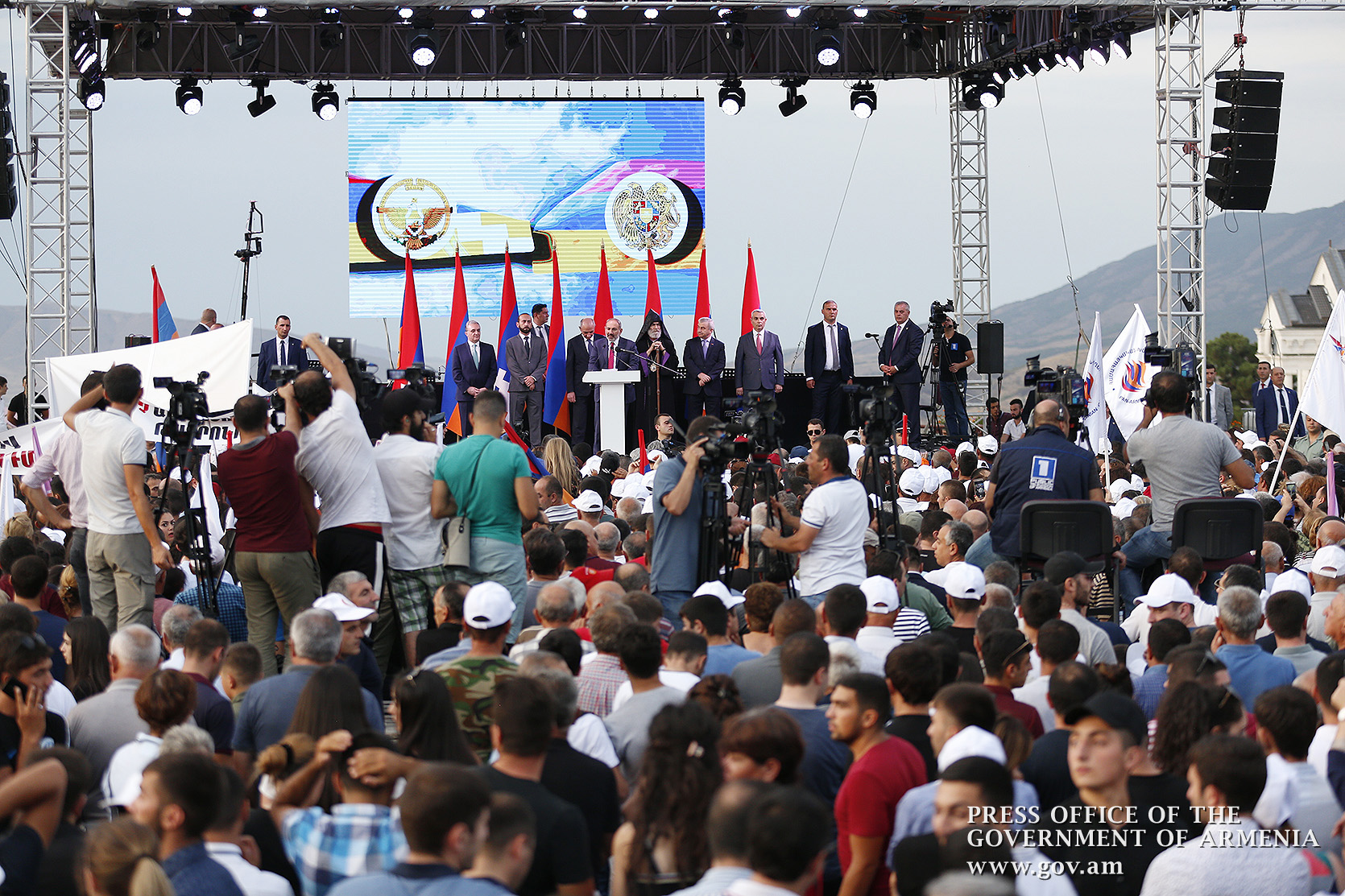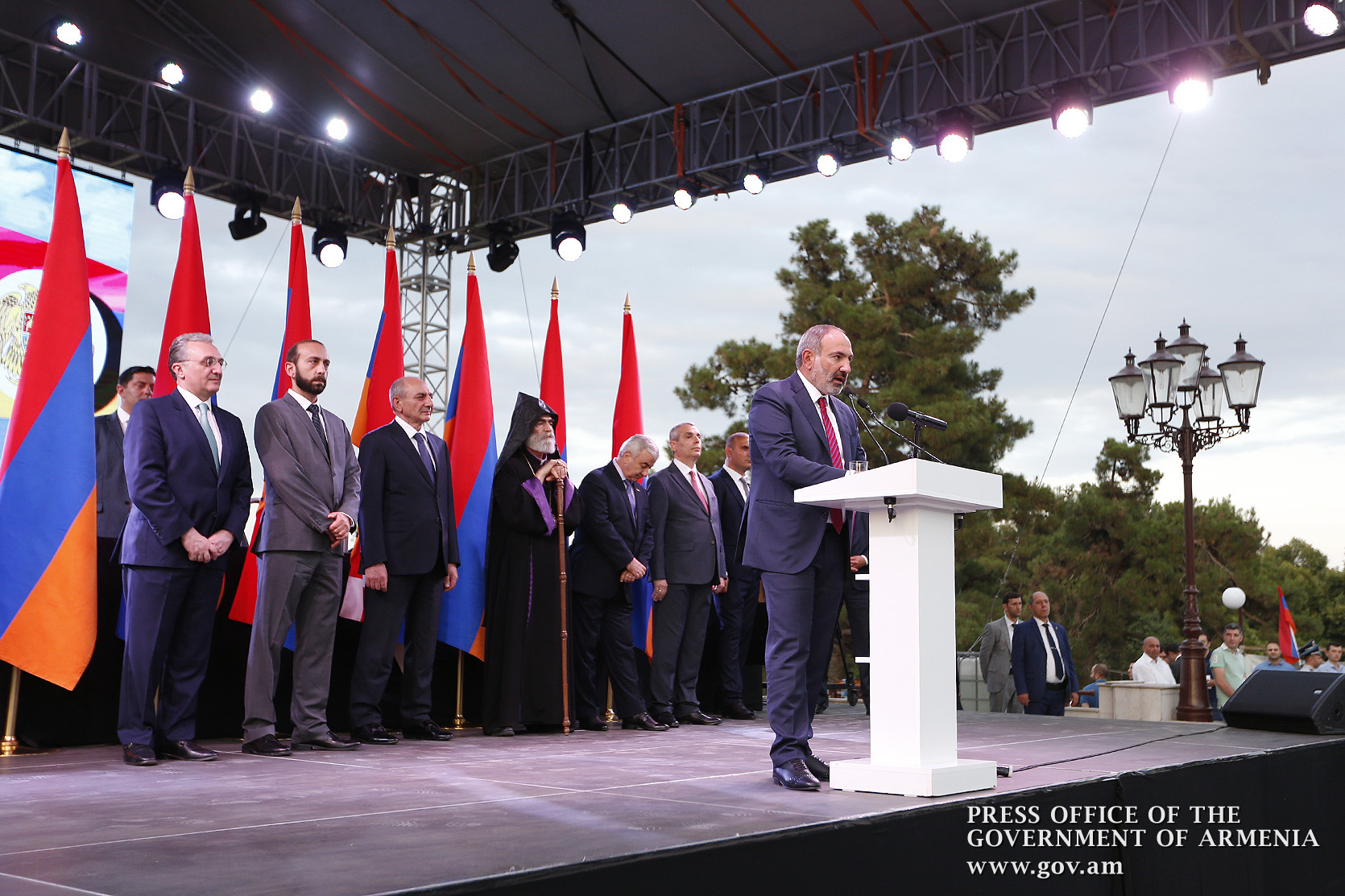 Ռազմավարական այս նպատակների իրագործումը պետք է դառնա համահայկական օրակարգի ողնաշարը։ Ես համոզված եմ՝ այս հավաքից հետո քննարկելու են, բաժանելու են, բազմապատկելու են՝ ինչքանով է իրատեսական այդ ծրագրի իրագործումը, ինչքանով է ռացիոնալ, ինչքանով է ճիշտ հաշվարկված։ Բայց խոսքն ամենևին դրա մասին չէ, խոսքը բոլորովին ուրիշ բանի մասին է։ Աշխարհի յուրաքանչյուր հայ պետք է ինքն իրեն երկու հարց տա և պատասխանի՝ ուզո՞ւմ է, որ Հայաստանի Հանրապետությունը լինի այսպիսի հայրենիք։ Եթե ուզում է, պատրա՞ստ է արդյոք ինքն իր բաժին ներդրումն ունենալ այդ հայրենիքի կերտման գործում։ Սա է սկզբունքային հարցը, և ես ուզում եմ ասել ընդհանրապես և ասել եմ հեղափոխության օրերին՝ իրատեսական ծրագրերը մեզ այլևս հետաքրքիր չեն։ Այն, ինչ հնարավոր է իրականացնել, մեզ այլևս հետաքրքիր չէ։ Մեզ հետաքրքիր է այն, ինչի իրականացումը բոլորը համարում են անհնար, որովհետև հայ ժողովուրդն անհնարինն իրականացնող ժողովուրդ է։ Եթե 1988 թվականին այս հրապարակում հավաքված մարդիկ մտածեին՝ հնարավո՞ր է արդյոք ազատագրել Արցախը, եթե այսպիսի հարց դնեին, շատերն այն ժամանակ էլ ասում էին՝ այդ ինչի՞ հետևից եք ընկել, դա հնարավոր չէ, բայց այսօր այստեղ՝ 2019 թվականի օգոստոսի 5-ին, մենք իրար հետ կանգնած ենք Արցախի Վերածննդի հրապարակում և արձանագրում ենք, որ այո՜, հայ ժողովուրդը վերածնվել է, և հայ ժողովուրդը պետք է հաղթի։