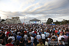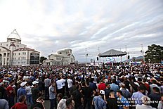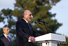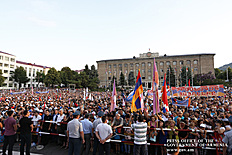Հայության հպարտության միջնաբերդի՝ Արցախի կենտրոնական հրապարակից ողջունում եմ աշխարհի բոլոր հայերին, ողջունում եմ աշխարհի հպարտ հայությանը և ուզում եմ ոգեկոչել այն կարգախոսը, որ 1988 թվականին թնդում էր այս հրապարակը, Վերածննդի այս հրապարակը. մի-ա-ցում, մի-ա-ցում։