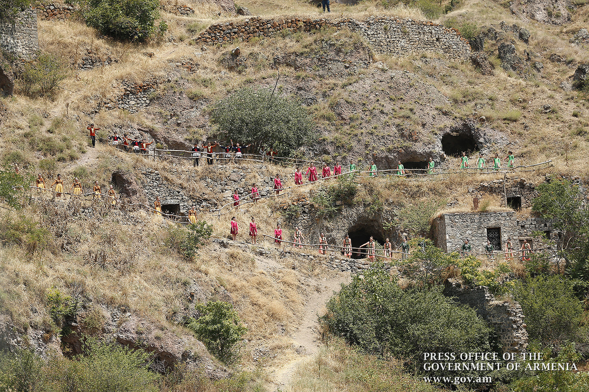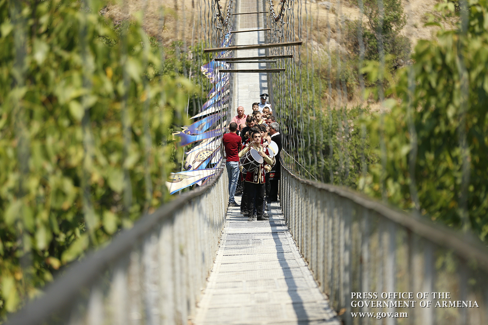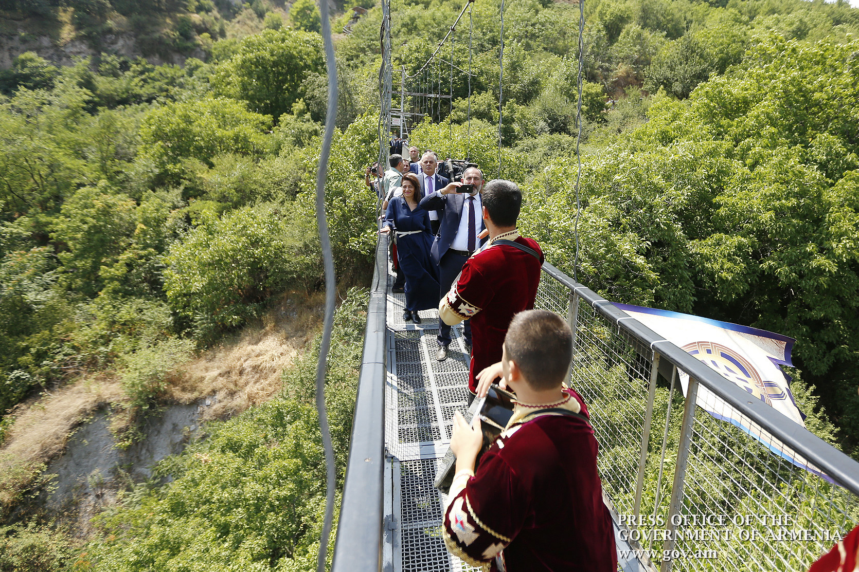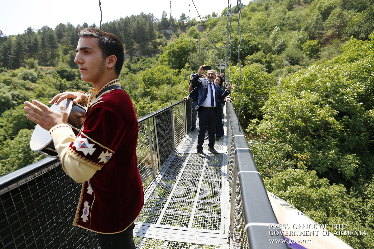 Վարչապետ Նիկոլ Փաշինյանը և տիկին Աննա Հակոբյանը նաև քայլել են Խնձորեսկի ճոճվող կամուրջով և դիտել կամուրջի հարակից տարածքում Սպարապետի օրվա առթիվ պատրաստված երաժշտական ցուցադրական ելույթները։