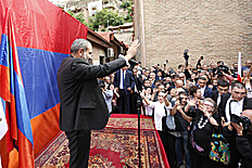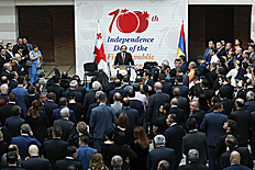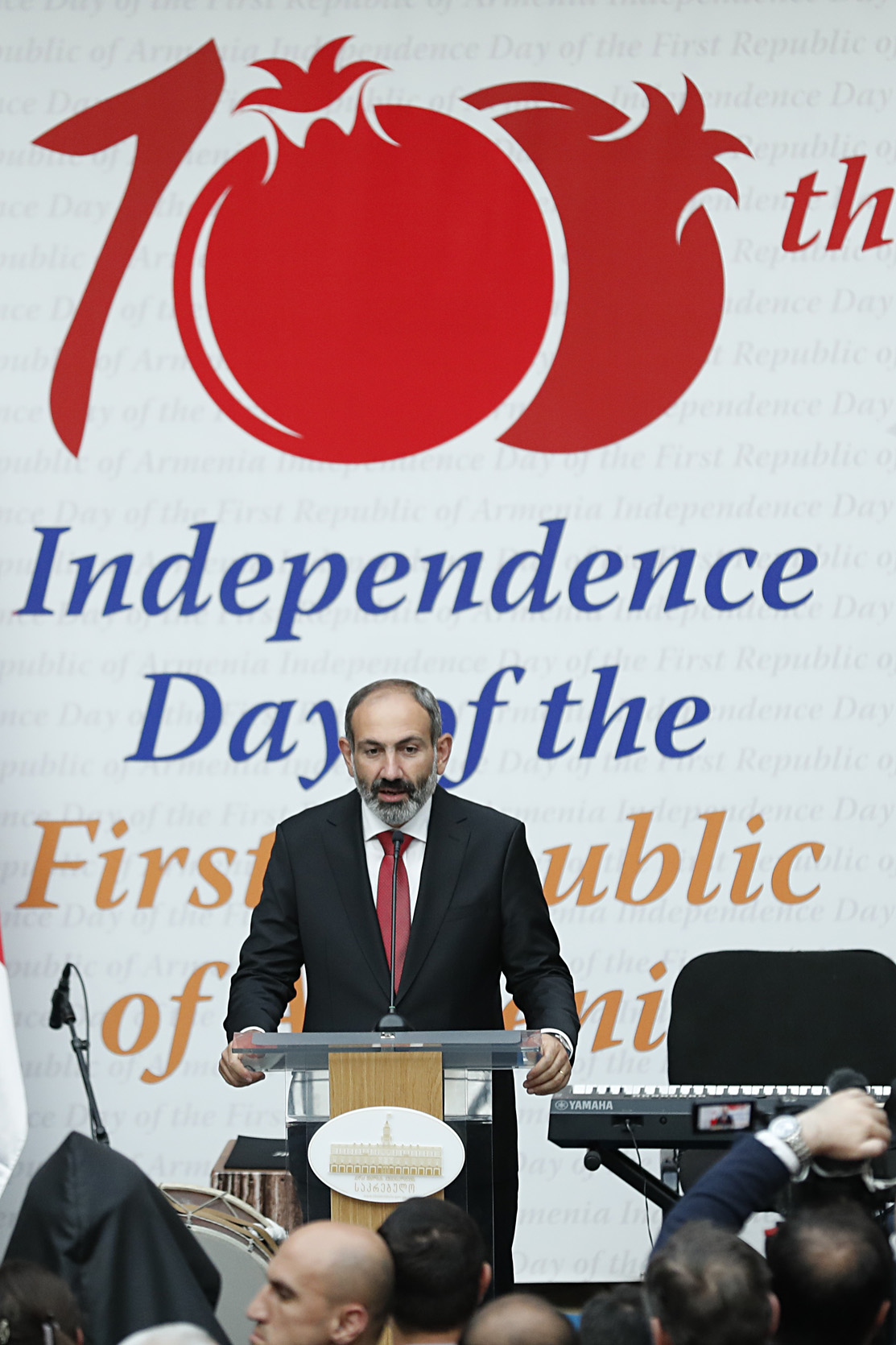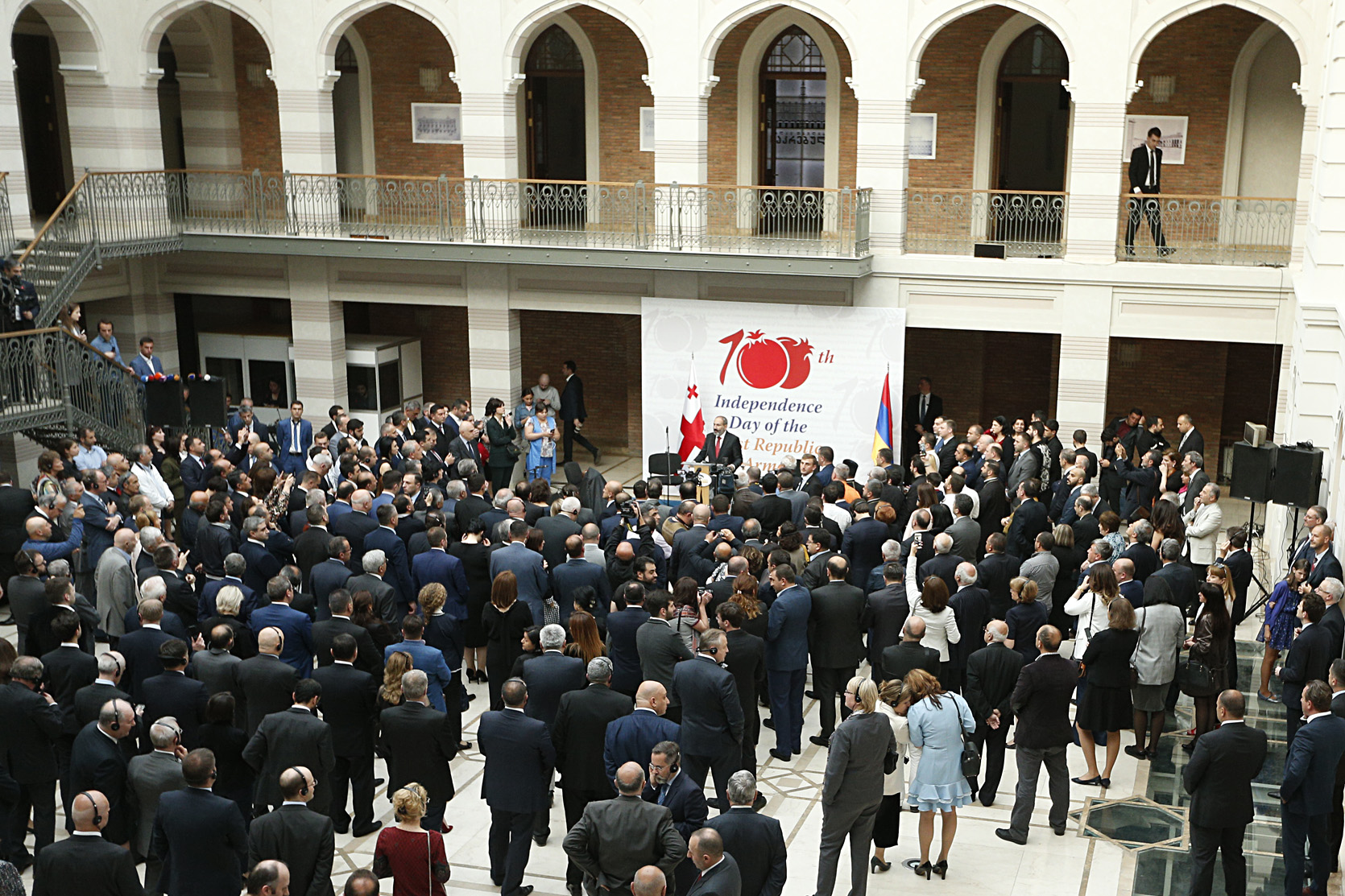 Շնորհավորում եմ մեզ Հայաստանի Առաջին Հանրապետության 100-ամյակի կապակցությամբ: Շնորհավորում եմ եղբայրական վրաց ժողովրդին և կառավարությանն անկախության, պետականության վերականգնման 100-ամյակի կապակցությամբ: Շնորհավորում եմ բոլորիս, որ մենք դարավոր հորձանուտների միջով անցնելով հասել ենք ի վերջո այստեղ: Եվ ինչպես ասում են, հիմա արդեն մեր ճակատագիրը մեր ձեռքերում է, և մենք բաց չենք թողի մեր ճակատագիրը մեր ձեռքերից, մենք բաց չենք թողնի այս հնարավորությունը մեր ձեռքերից, որովհետև մենք հաղթել ենք, մենք հաղթում ենք և մենք հաղթելու ենք ապագայում: Եվ ուրեմն՝