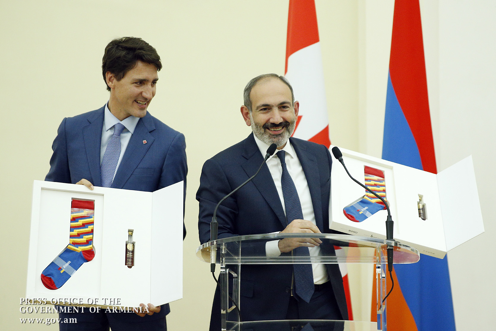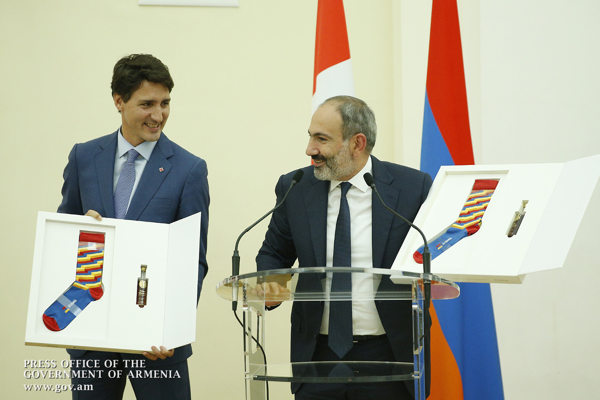 Բայց սա ամենը չէ: Ես մտածում էի՝ ինչո՞վ է հայտնի պարոն Թրյուդոն, և ինչո՞վ եմ հայտնի ես, և ինչո՞վ կարող եմ ես մրցակցել մեր սիրելի վարչապետի հետ: Կարծում եմ, որ հայտնի եմ իմ սելֆիներով, իսկ պարոն Թրյուդոն՝ իր գուլպաներով: Եվ Հայաստանում կա մի ընկերություն, որը որոշել է, որ առանձնահատուկ նվեր պետք է անի երկուսիս՝ սրանով գուցե հիմք դնելով մի լավ բարեկամության: Այս գուլպաներից մեկն իմն է, պարոն վարչապետ, մեկը՝ Ձերը:
