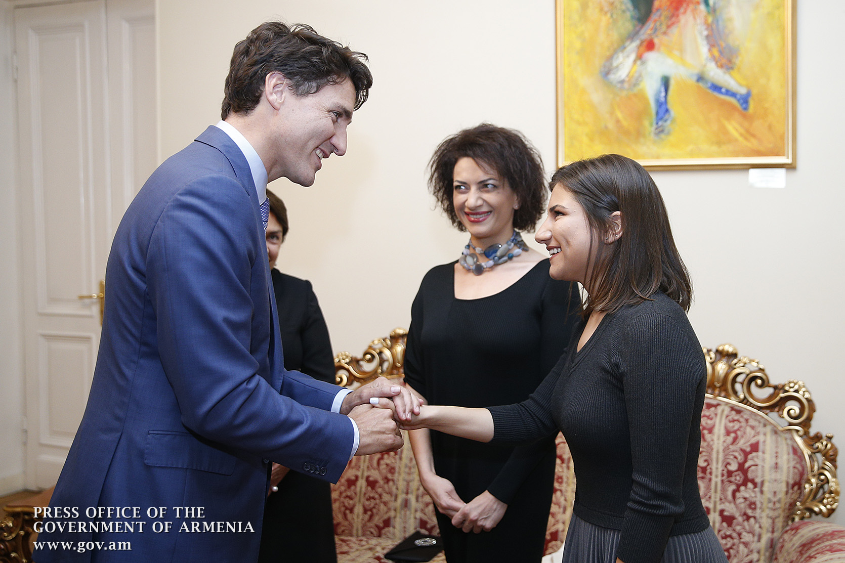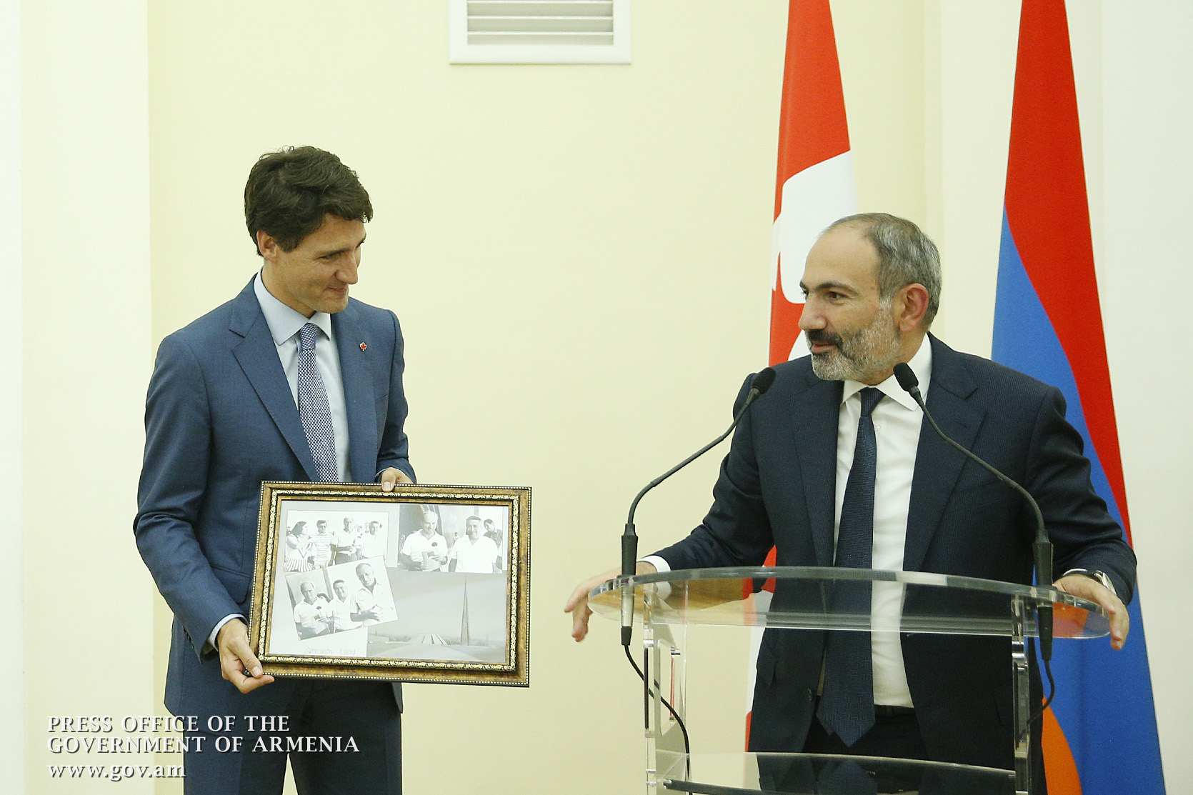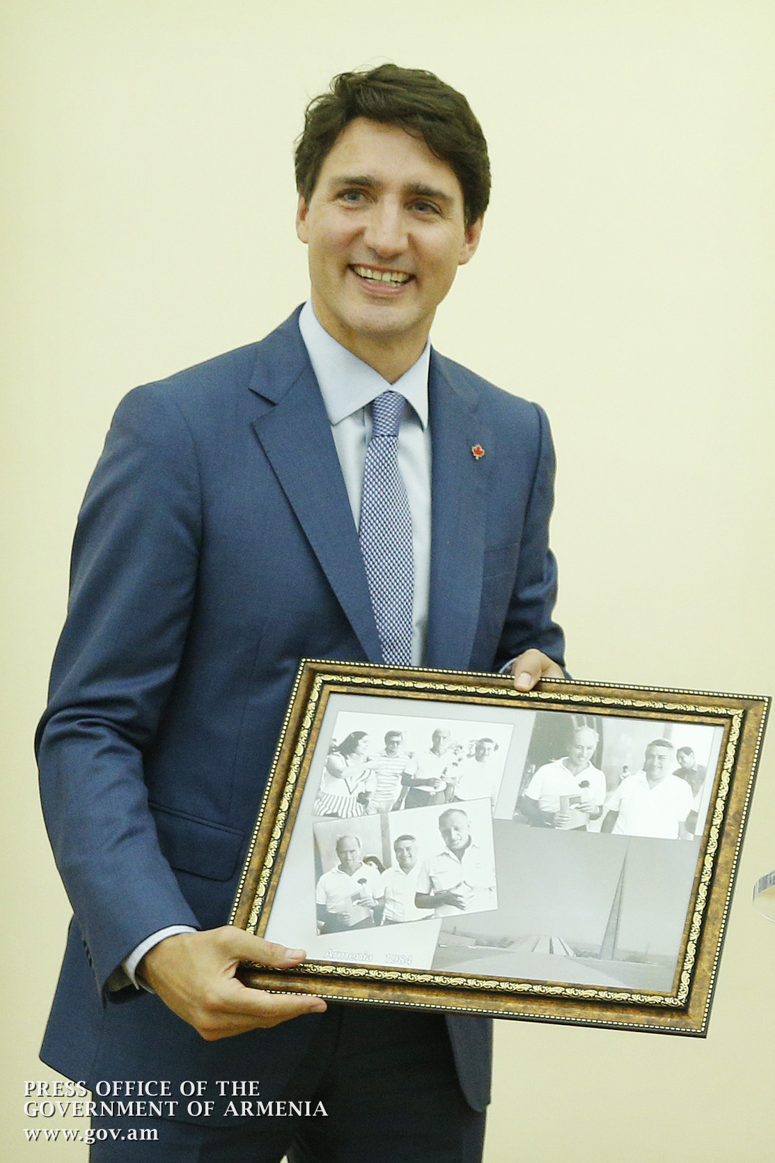 Հայաստանում շատ է քննարկվում դա, և պարոն վարչապետն էլ նշեց, որ 1984 թվականին իր հոր՝ Պիեռ Թրյուդոյի հետ Հայաստան այցելելու առիթ է ունեցել: Եվ հույս ունեմ, որ պարոն Թրյուդոն հասկանում է, որ խորհրդային այդ ժամանակաշրջանում իր հայրիկի հետ մենակ չեն եղել, մենակ չեն եղել, մենակ չեն եղել: Եվ մեր երկրի Ազգային անվտանգության ծառայությունը փնտրել և գտել է այս լուսանկարը Պետական անվտանգության կոմիտեի արխիվներից: Ի՞նչն է հետաքրքիր. քանի որ պարոն Թրյուդոն այն ժամանակ տակավին մանուկ է եղել և հետաքրքրություն չի ներկայացրել Պետական անվտանգության կոմիտեի համար, նա որևէ կերպ օբյեկտիվի տեսարանում չի հայտնվել: Հաճույքով սա նվիրում եմ իմ բարեկամին:
