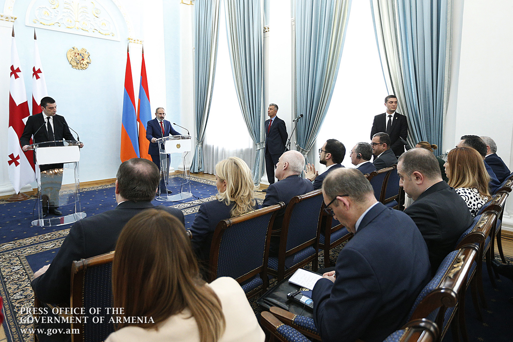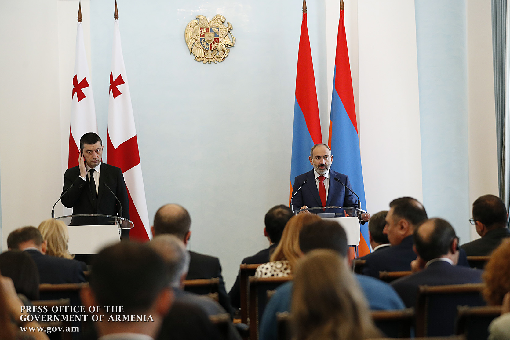 Հայաստանի վարչապետ Նիկոլ Փաշինյանը և Վրաստանի վարչապետ Գեորգի Գախարիան առանձնազրույցից և երկու երկրների պատվիրակությունների ընդլայնված կազմով բանակցություններից հետո հանդիպել են ԶԼՄ ներկայացուցիչներին և հանդես եկել մամուլի համար հայտարարություններով: