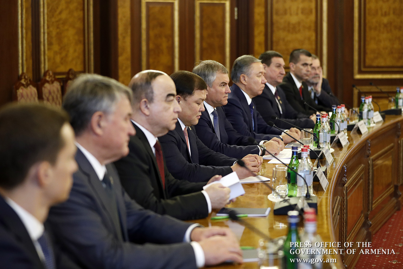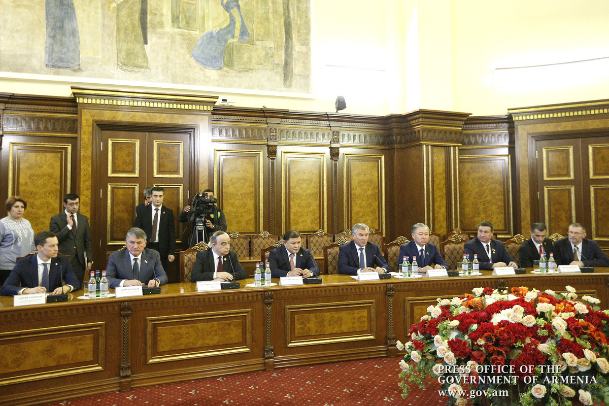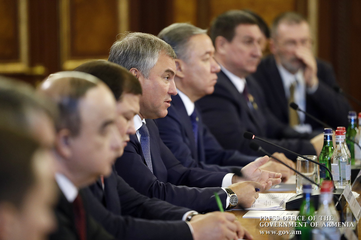 Վյաչեսլավ Վոլոդինը շնորհակալություն է հայտնել ջերմ ընդունելության համար և նշել, որ երևանյան հանդիպմանը քննարկում են ՀԱՊԿ միջխորհրդարանական կապերի զարգացմանը, օրենսդրությունների ներդաշնակեցմանը, տարածաշրջանում առկա մարտահրավերների համատեղ դիմագրավմանը վերաբերող մի շարք հարցեր: Ռուսաստանի Պետդումայի նախագահը կարևորել է ՀԱՊԿ միջազգային համագործակցության ընդլայնումը և ներկայացրել այդ ուղղությամբ տարվող աշխատանքների ընթացքը: