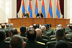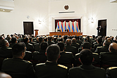 Այս առումով պիտի ընդգծեմ, որ թերևս այս վերջին մեկ տարվա ընթացքում Ազգային անվտանգության ծառայությունը, մեր մի շարք այլ կառույցների հետ, մեր պետականության, ինքնիշխանության և անկախության պահպանման և պաշտպանության շատ էական և կարևոր գործառույթ է իրականացրել, և ես ուզում եմ ևս մեկ անգամ շնորհակալություն հայտնել այդ գործառույթն արդյունավետ կերպով իրականացնելու համար: Բայց մենք նաև պիտի ընդգծենք, որ մեր առաջ եղած և առկա մարտահրավերները չեզոքացված չեն, և այս ընթացքում մեր ձեռք բերած փորձը պիտի օգտագործենք պետականության, ինքնիշխանության, անկախության, մեր Սահմանադրության և օրենսդրության, մեր տարածքային ամբողջականության պահպանման գործում առավել արդյունավետ լինելու համար: