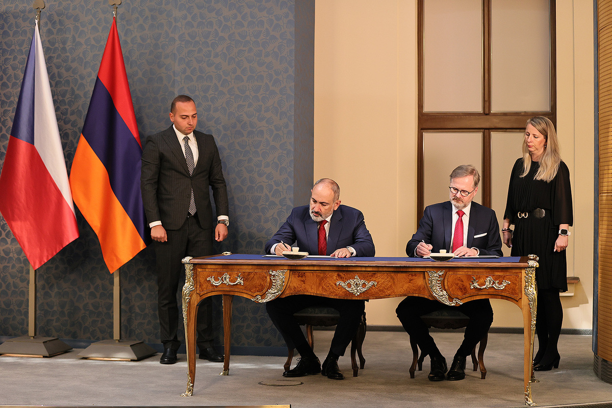 «Հայաստանի Հանրապետության վարչապետ Նիկոլ Փաշինյանը և Չեխիայի Հանրապետության վարչապետ Պետր Ֆիալան վարչապետ Նիկոլ Փաշինյանի՝ Չեխիայի Հանրապետություն կատարած պաշտոնական այցի շրջանակներում կայացած բարձր մակարդակի բանակցությունների ավարտին,