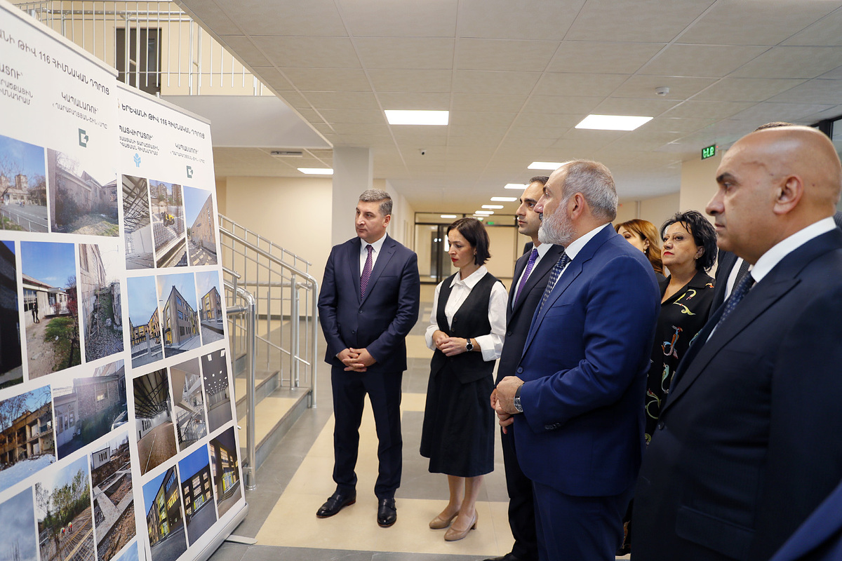 Վարչապետի առաջին կանգառը եղել է Երևանի թիվ 116 հիմնական դպրոցը, որը կառուցվել է ՀՀ կառավարության և Ասիական զարգացման բանկի կողմից իրականացվող դպրոցների «Սեյսմիկ անվտանգության բարելավման ծրագրի» շրջանակում: Դպրոցի նախագծային աշխատանքները մեկնարկել են 2019 թ. փետրվարից, շինարարական աշխատանքները՝ 2020 թ. հոկտեմբերից, ավարտվել է 2023 թ. հունվարին: Շինարարական աշխատանքներն իրականացվել են Ասիական զարգացման բանկի միջոցներով: Ընդհանուր առմամբ դպրոցի կառուցմանը տրամադրվել է 1,391,580.8 հազար դրամ: Բացի կառուցումից դպրոցը նաև նոր գույքով է հագեցվել, որի համար հատկացվել է 35,805.6 հազ. դրամ: Շենքային պայմանները համապատասխանում են ժամանակակից կրթական պահանջներին: Դպրոցն ունի նաև բարեկարգված՝ կանաչապատ և ասֆալտապատ բակային տարածք: Նոր ուսումնական տարում դպրոցում սովորելու է 465 աշակերտ: