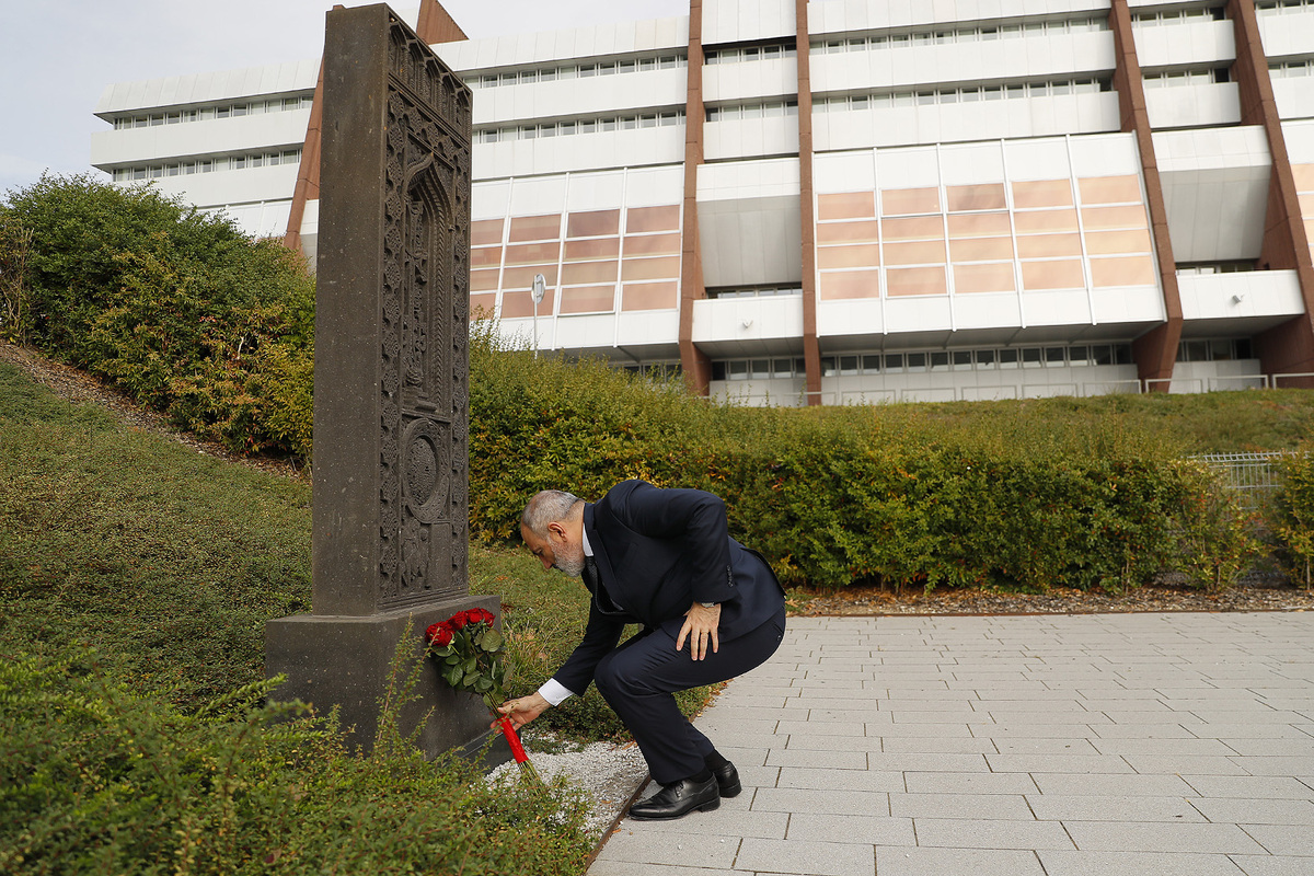Վարչապետ Փաշինյանը Եվրոպայի խորհրդի կենտրոնակայանի դիմաց ծաղիկներ է խոնարհել հայկական խաչքարի մոտ: