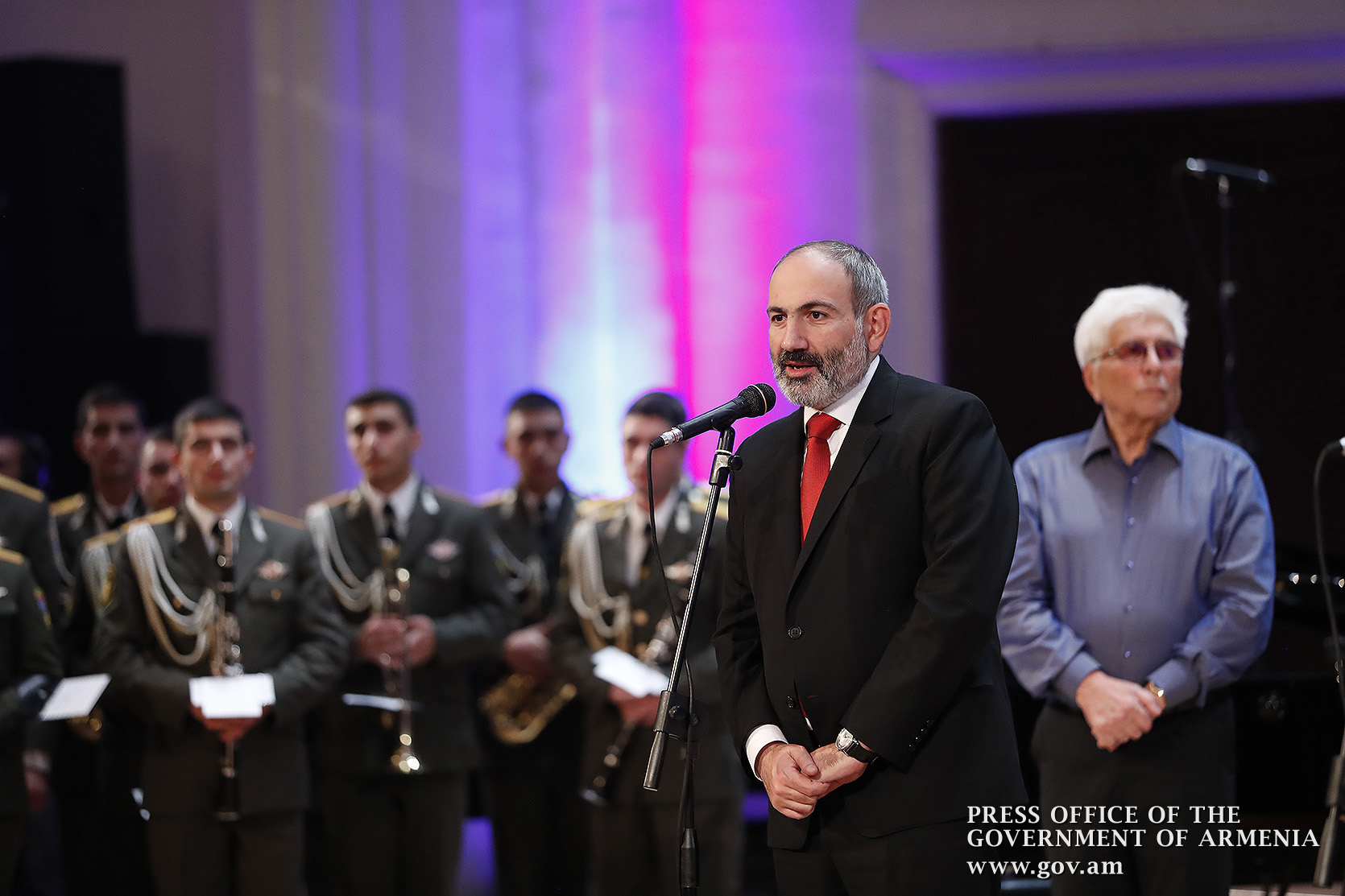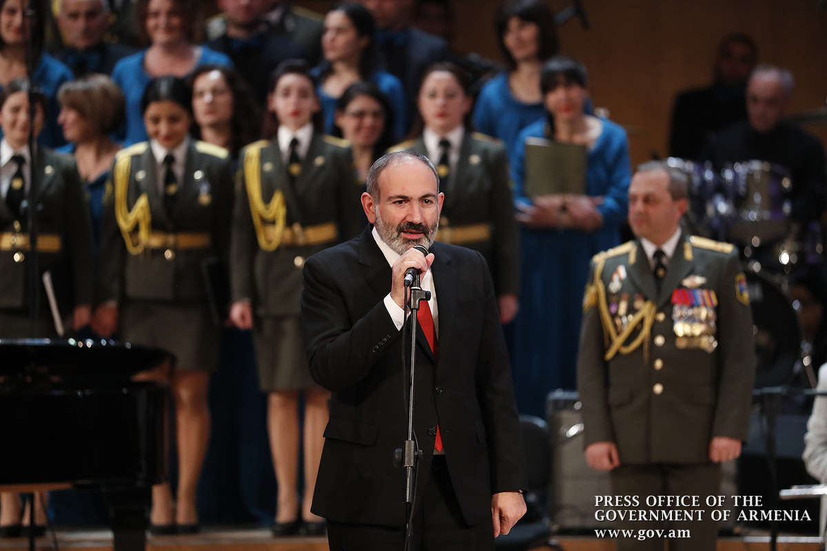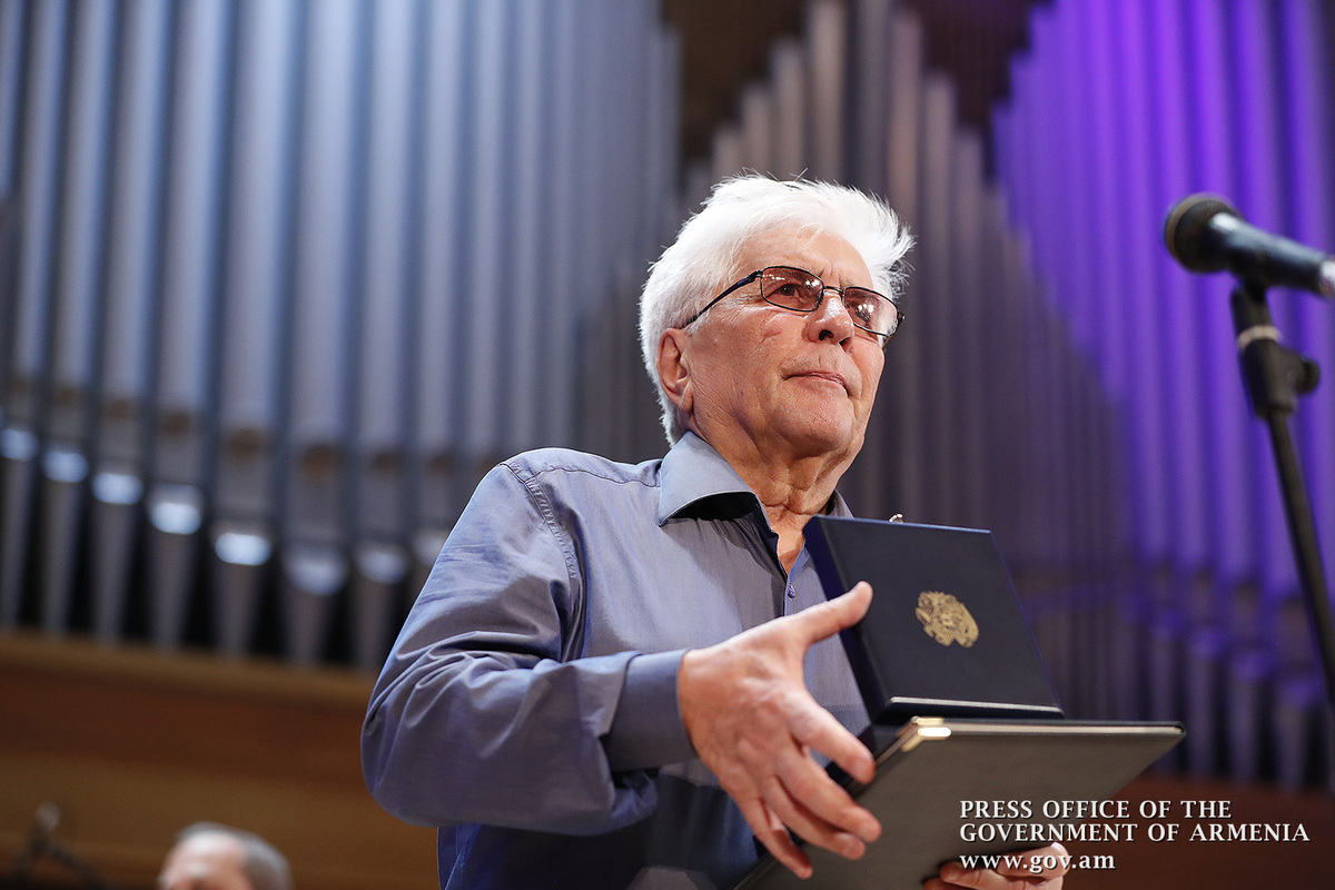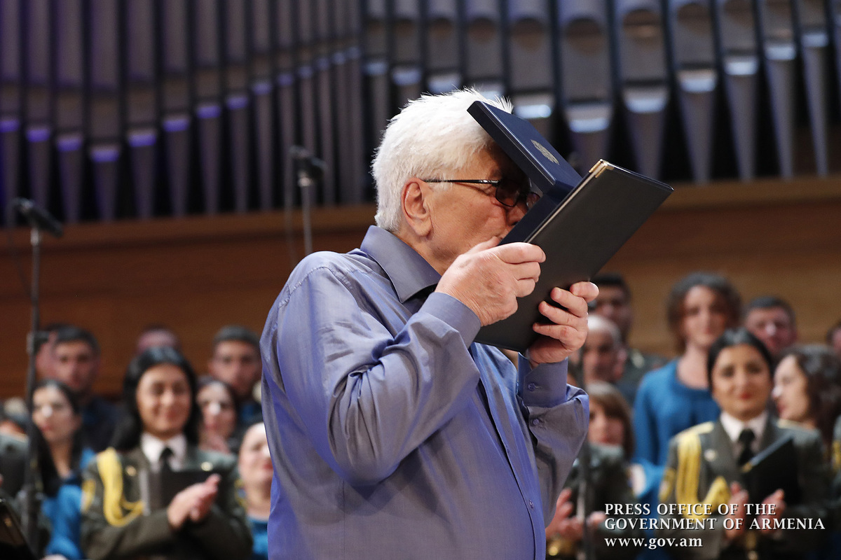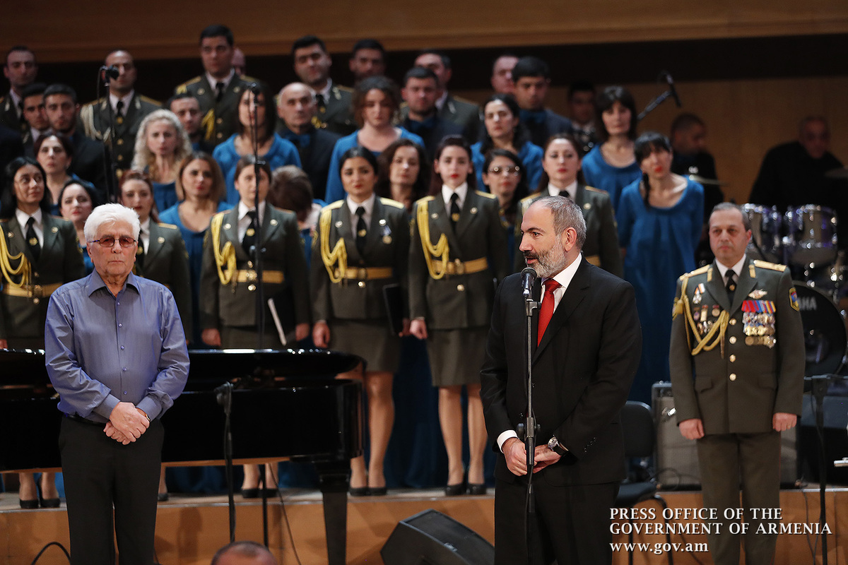 Ինձ համար մեծ պատիվ է այսօր այս առիթով այս դահլիճում իմ շնորհավորանքը հղել Ձեզ՝ Ձեր 80-ամյակի կապակցությամբ և իմ երախտագիտությունը հայտնել Հայաստանի Հանրապետության կառավարության անունից, Հայաստանի Հանրապետության քաղաքացիների անունից, հայ ժողովրդի անունից՝ այն ժառանգության համար, որ մենք այսօր կարող ենք ունենալ որպես մեզնից յուրաքանչյուրի սեփականություն, մեր ազգային, մեր ժողովրդական սեփականություն։ Մենք այսօր այստեղ հավաքվել ենք Ձեզ պատվելու և մեր մեծարանքի ու երախտագիտության տուրքը մատուցելու Ձեր ստեղծած ժառանգության համար, որն այսօր ժառանգվեց նաև մեր փոքրիկներին՝ ի դեմս «Ծիածան» նվագախմբի, ի դեմս բազմաթիվ այլ մանկական նվագախմբերի, որ երգելու են, և, իհարկե, մեր Զինված ուժերի հիմնը, մեր հոգու հիմնը, մեր երազանքների հիմնը, որն այն մասին է, որ մենք ունենք հայրենիք, որի մասին երազել ենք, և մենք ունենալու ենք հայրենիք, որի մասին շարունակում ենք երազել»։