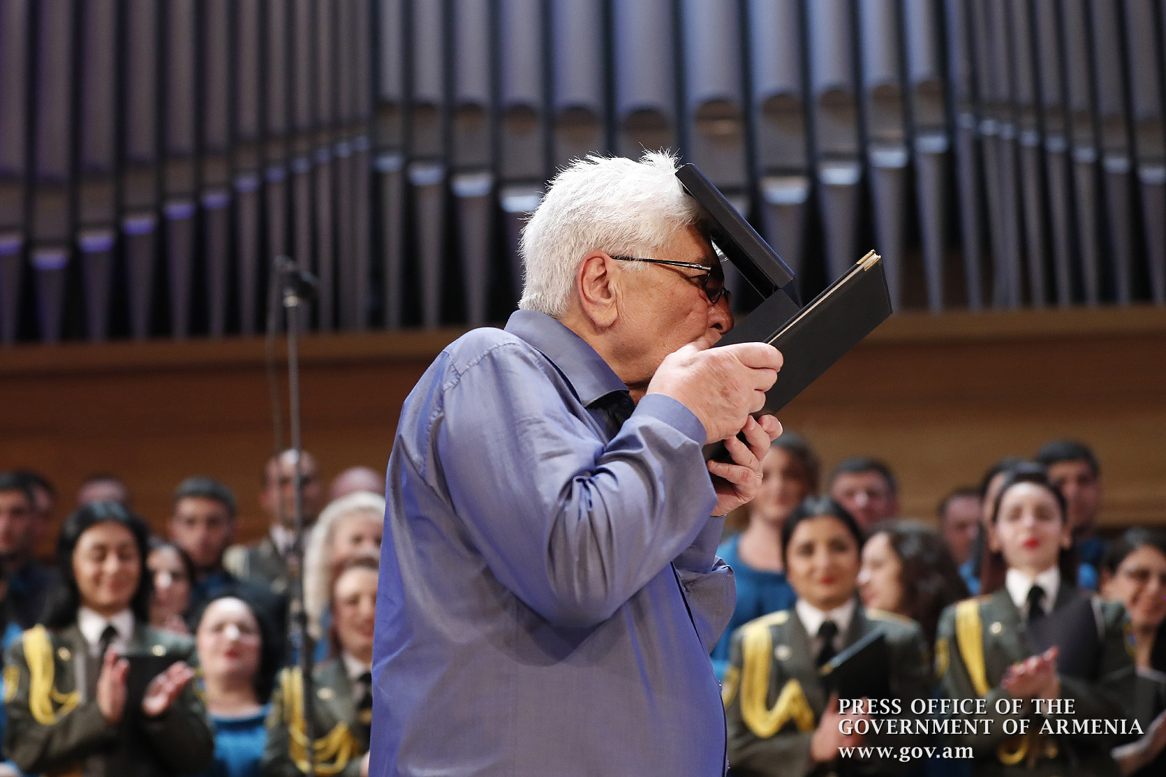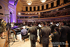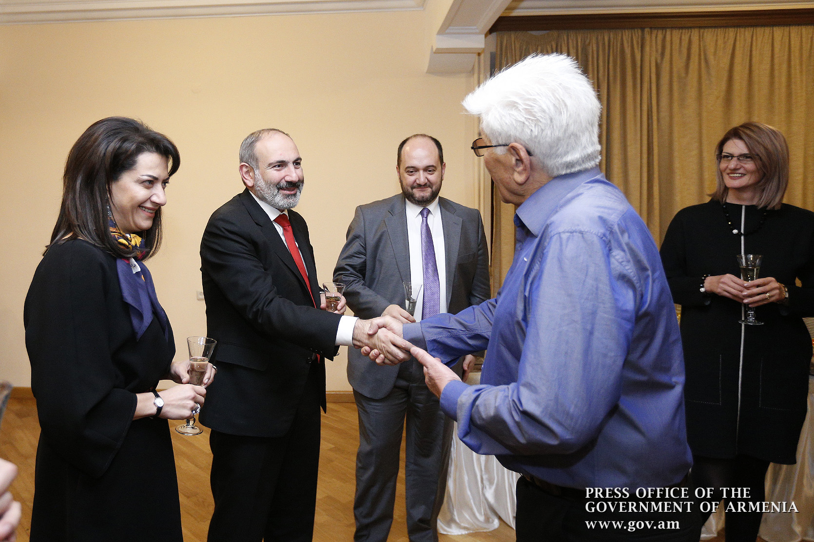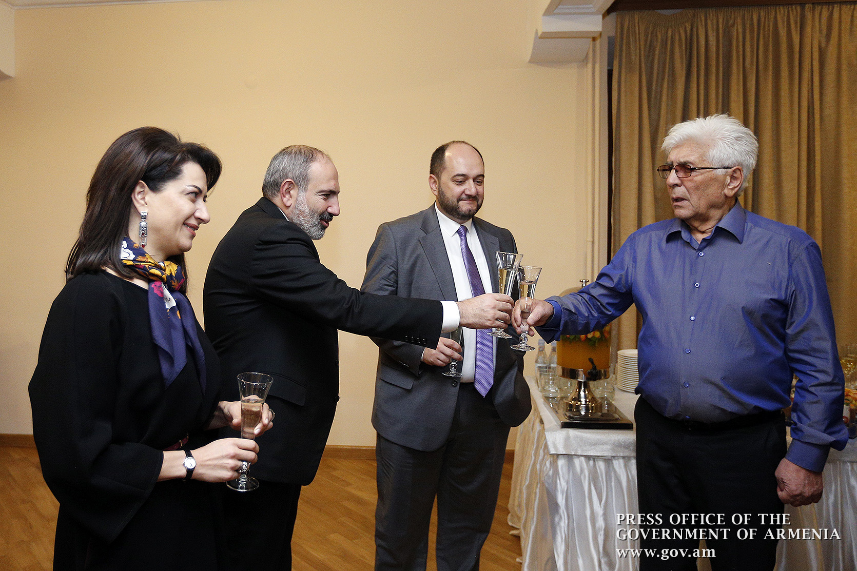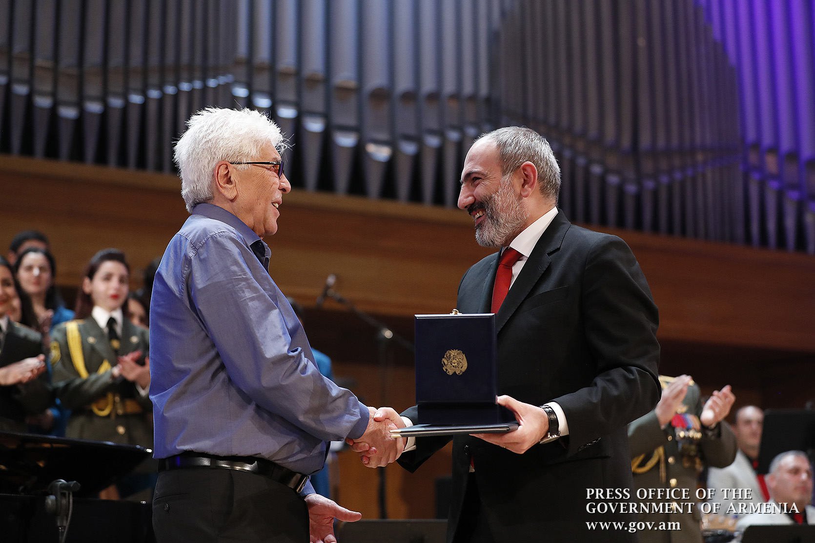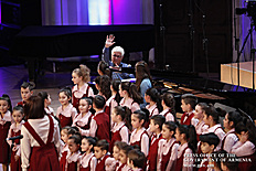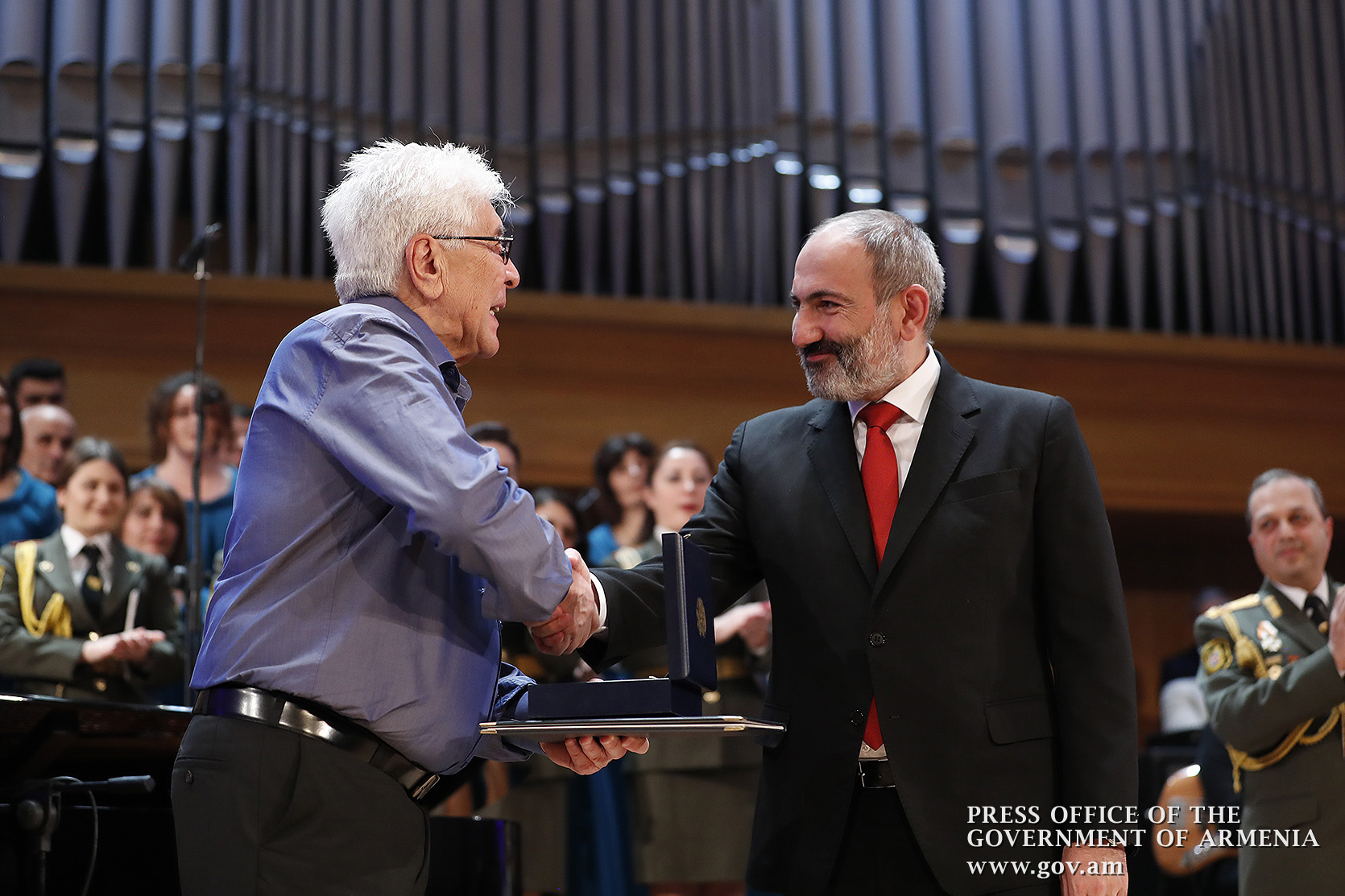 Ինձ համար մեծ պատիվ է այսօր այս առիթով այս դահլիճում իմ շնորհավորանքը հղել Ձեզ՝ Ձեր 80-ամյակի կապակցությամբ և իմ երախտագիտությունը հայտնել Հայաստանի Հանրապետության կառավարության անունից, Հայաստանի Հանրապետության քաղաքացիների անունից, հայ ժողովրդի անունից՝ այն ժառանգության համար, որ մենք այսօր կարող ենք ունենալ որպես մեզնից յուրաքանչյուրի սեփականություն, մեր ազգային, մեր ժողովրդական սեփականություն։ Մենք այսօր այստեղ հավաքվել ենք Ձեզ պատվելու և մեր մեծարանքի ու երախտագիտության տուրքը մատուցելու Ձեր ստեղծած ժառանգության համար, որն այսօր ժառանգվեց նաև մեր փոքրիկներին՝ ի դեմս «Ծիածան» նվագախմբի, ի դեմս բազմաթիվ այլ մանկական նվագախմբերի, որ երգելու են, և, իհարկե, մեր Զինված ուժերի հիմնը, մեր հոգու հիմնը, մեր երազանքների հիմնը, որն այն մասին է, որ մենք ունենք հայրենիք, որի մասին երազել ենք, և մենք ունենալու ենք հայրենիք, որի մասին շարունակում ենք երազել»։