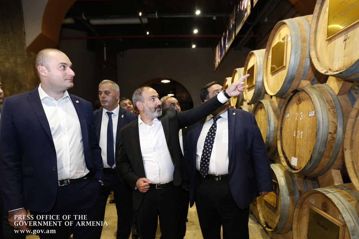 После официального обеда Никол Пашинян и Мамука Бахтадзе посетили Музей Арарат Ереванского коньячного завода, где ознакомились с историей и процессом производства армянского коньяка “Арарат”. Премьер-министрам была также представлена “Бочка мира”, в которой с 1994 года, когда было достигнуто перемирие в Карабахской войне, хранится коньячный спирт. Она называется “Бочкой мира”, так как будет открыта только тогда, когда будет урегулирован карабахский конфликт.