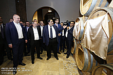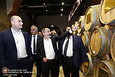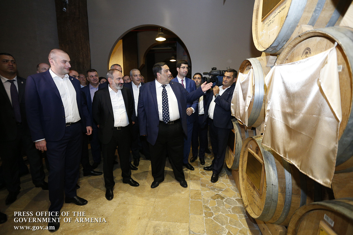Никол Пашинян и Мамука Бахтадзе оставили свои подписи в Книге почетных гостей и приняли участие в церемонии основания именных бочек, которые начали выдерживать в честь визита премьер-министров Армении и Грузии.