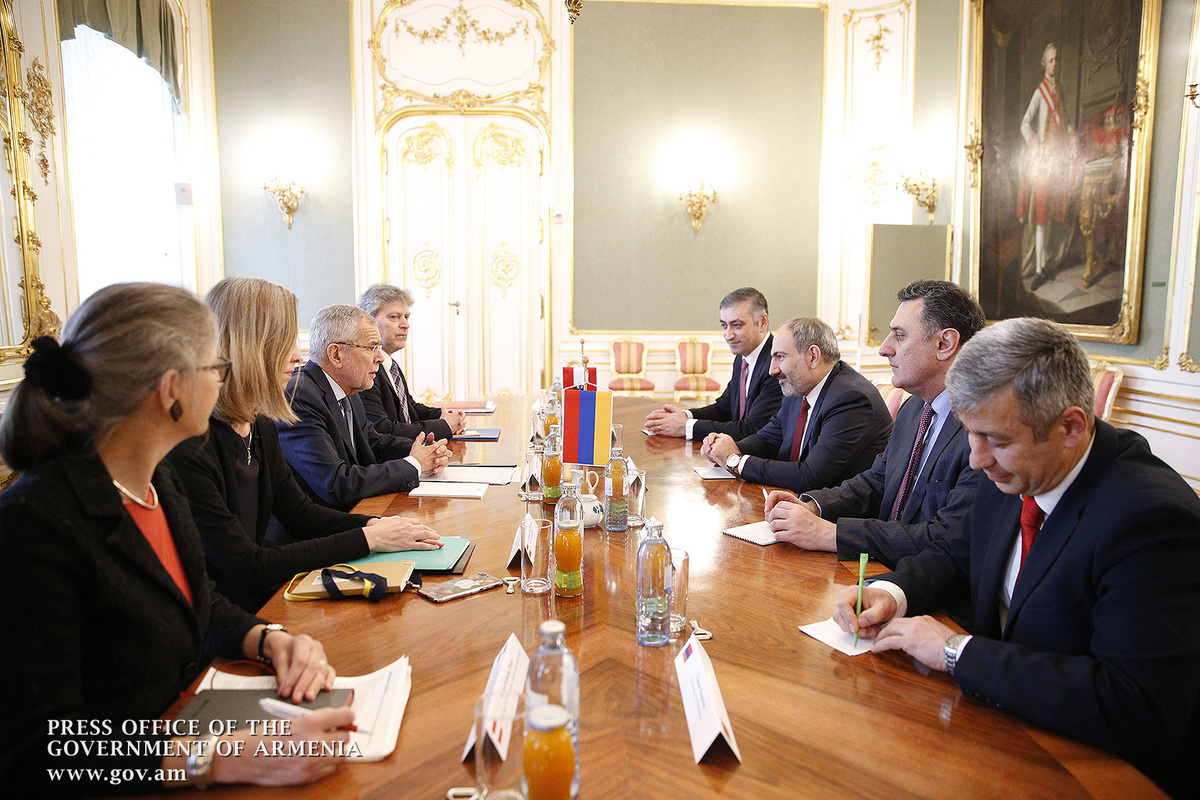 Президент Австрии тепло приветствовал премьер-министра Пашиняна и отметил, что его страна придает большое значение постоянному развитию и расширению отношений с Арменией в различных сферах. Александр Ван дер Беллен поздравил Никола Пашиняна с происходящими в Армении активными реформами и выразил уверенность, что наша страна в ближайшие годы пойдет путем развития и укрепления демократии. Коснувшись двустороннего экономического взаимодействия, президент Австрии отметил, что его страна готова обсудить возможности реализации различных инвестиционных программ в Армении.
