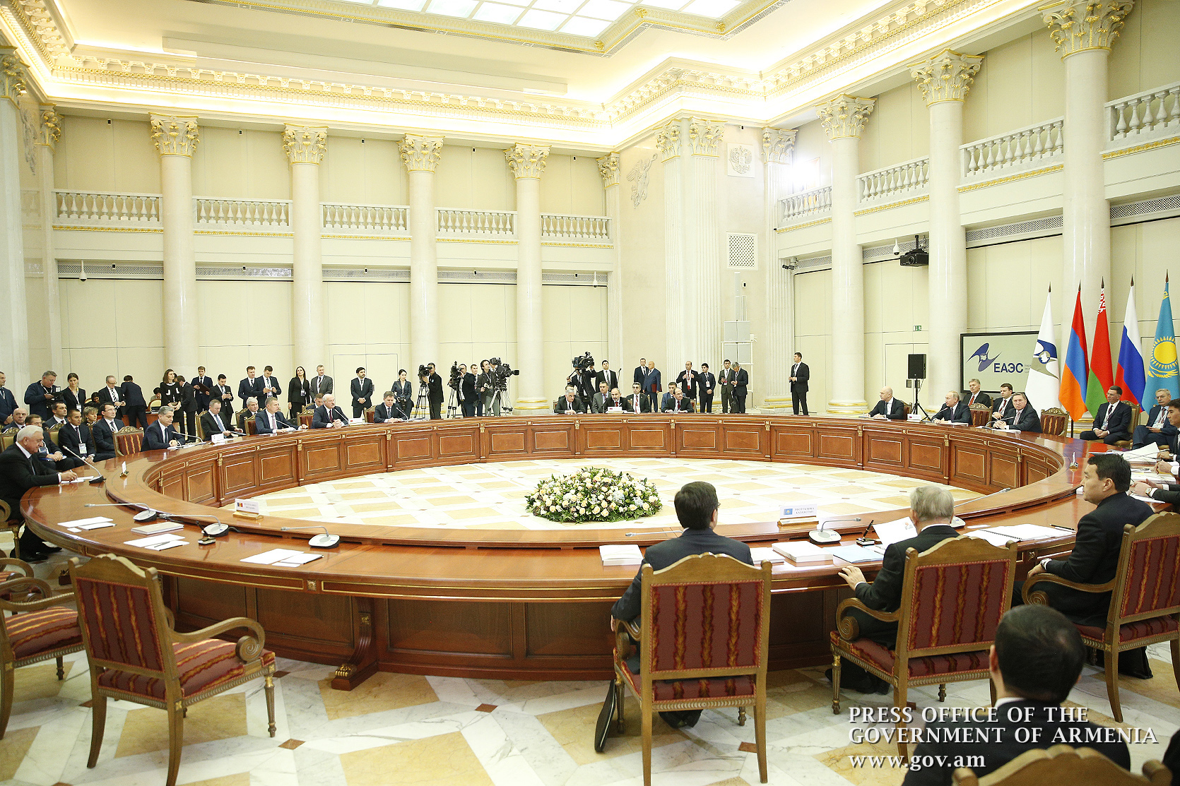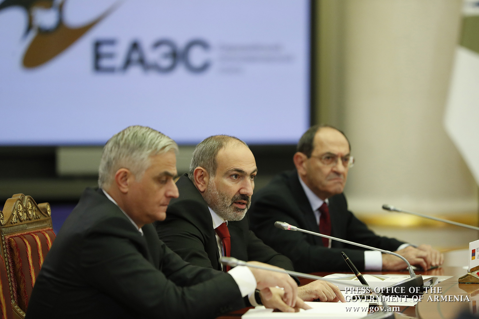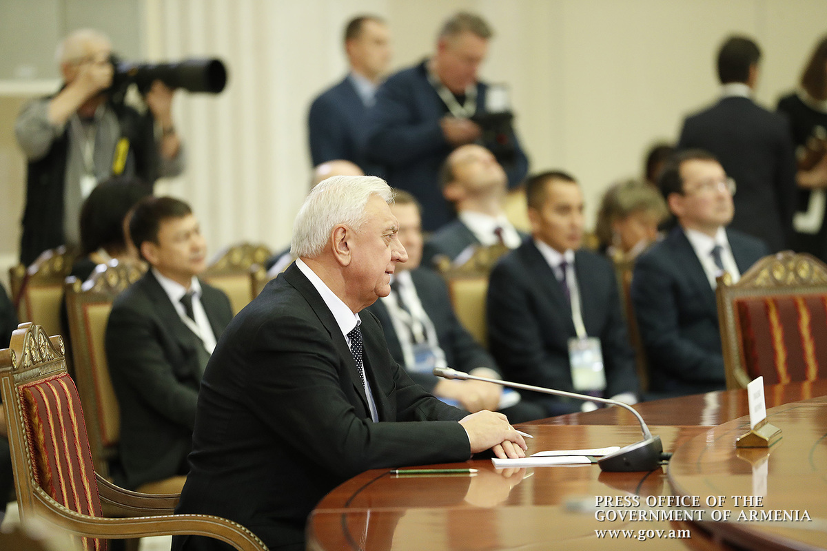 “Уважаемые коллеги, приветствую всех. Фактически, мы заканчиваем год в очень хорошем настроении. Я хочу сказать, что сегодня у нас есть консенсус по всем вопросам нашей повестки дня, и мы сразу же можем перейти к процедуре подписания документов, и я думаю, что это очень хороший знак и очень хорошая атмосфера, что у нас, фактически, есть согласие по всем вопросам. Поскольку заканчивается председательство Армении в органах ЕАЭС, хочу поблагодарить всех коллег за совместную работу. Думаю, что у нас получилось довольно хорошее, эффективное, плодотворное председательство. Уверен, что мы продолжим наше сотрудничество в этом духе. Я поздравляю Беларусь с принятием председательства и желаю всего наилучшего”.