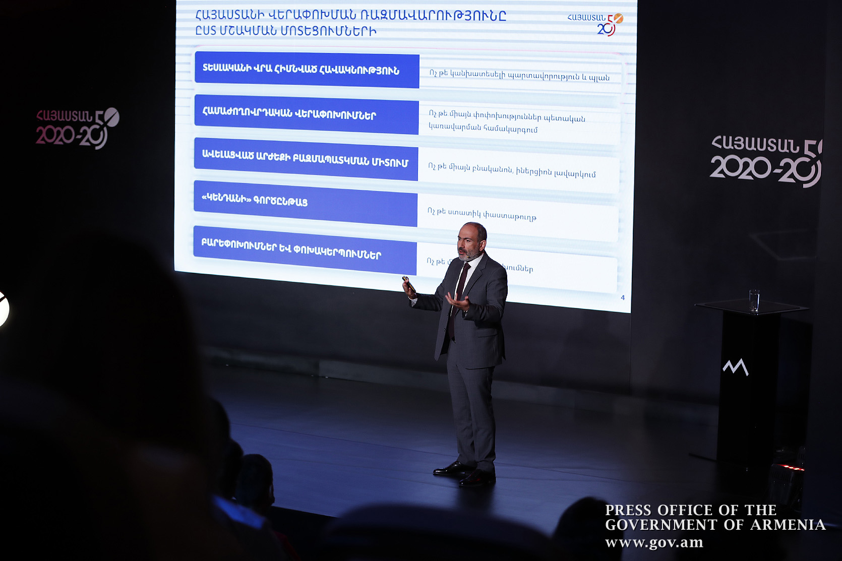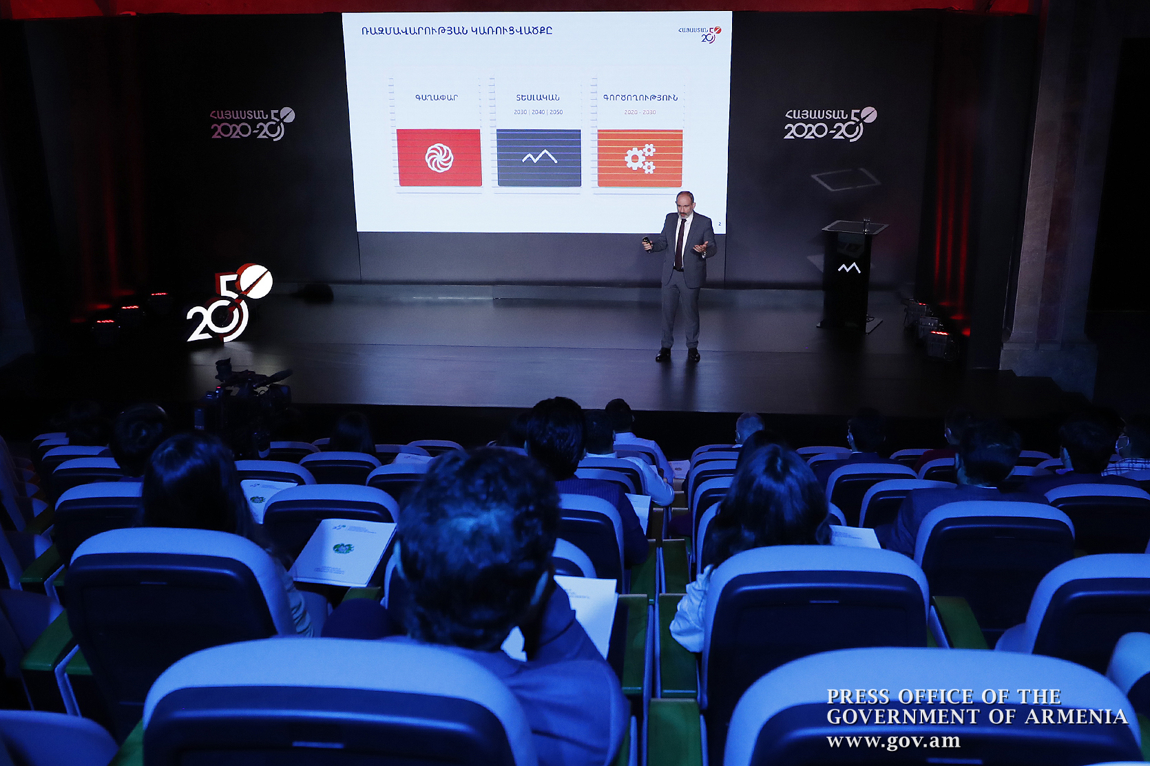 Никол Пашинян еще раз подчеркнул важность формирования общенационального движения по преобразованию Армении. “В ближайшее время у нас появится сайт “Армения 2050”, который станет также рабочей площадкой для обсуждений, предложений и критики. Когда мы вступали в 2020 год, я сказал, что отныне мы переходим к стратегическому управлению. При этом, мы планировали провести эту презентацию в апреле - в День гражданина, но по известным причинам отложили его. Сейчас мы должны осуществлять стратегическое управление своей повседневной работой, и любое решение какого-либо государственного органа должно иметь логическую и практическую связь с этой стратегией”, - заключил премьер-министр.