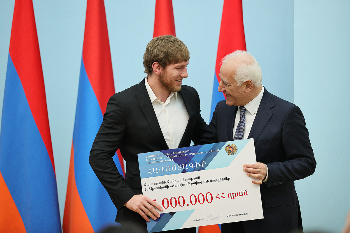 В список 10 лучших спортсменов Республики Армения в 2022 году вошли: Артур Алексанян (борьба, чемпион мира); Малхас Амоян (борьба, чемпион Европы, 3-е место на Чемпионате мира); Ованес Бачков (бокс, чемпион Европы); Самвел Гаспарян (тяжелая атлетика, 3-е место на Чемпионате мира, вице-чемпион Европы); Артур Давтян (гимнастика, чемпион мира, вице-чемпион Европы); Вараздат Лалаян (тяжелая атлетика, 3-е место на Чемпионате мира, вице-чемпион Европы); Арсен Арутюнян: (борьба, 3-е место на Чемпионате мира, чемпион Европы); Ани Овсепян (бокс, чемпионка Европы); Арутюн Мердинян (спортивная гимнастика, 3-е место на Чемпионате мира, чемпион Европы); Лилит Мкртчян (стрельба, чемпионка Европы, 3-е место на Чемпионате мира).